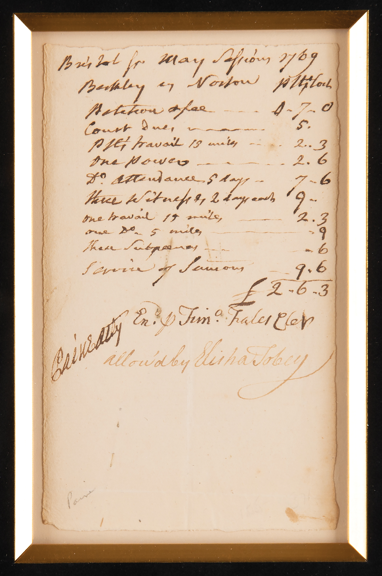 Massachusetts lawyer (1731-1814) who served as one of the prosecutors of British soldiers during the Boston Massacre trial; he later signed the Declaration of Independence. ADS, signed "Paine, Atty," one page, 3.75 x 6.25, May 1769. Handwritten bill for his legal services in the amount of £2.6.3, including charges for "Court dues," "Subpoenas," "Attendance 5 days," and more. Nicely cloth-matted and framed with a portrait and biographical caption to an overall size of 19.5 x 19. In fine condition.