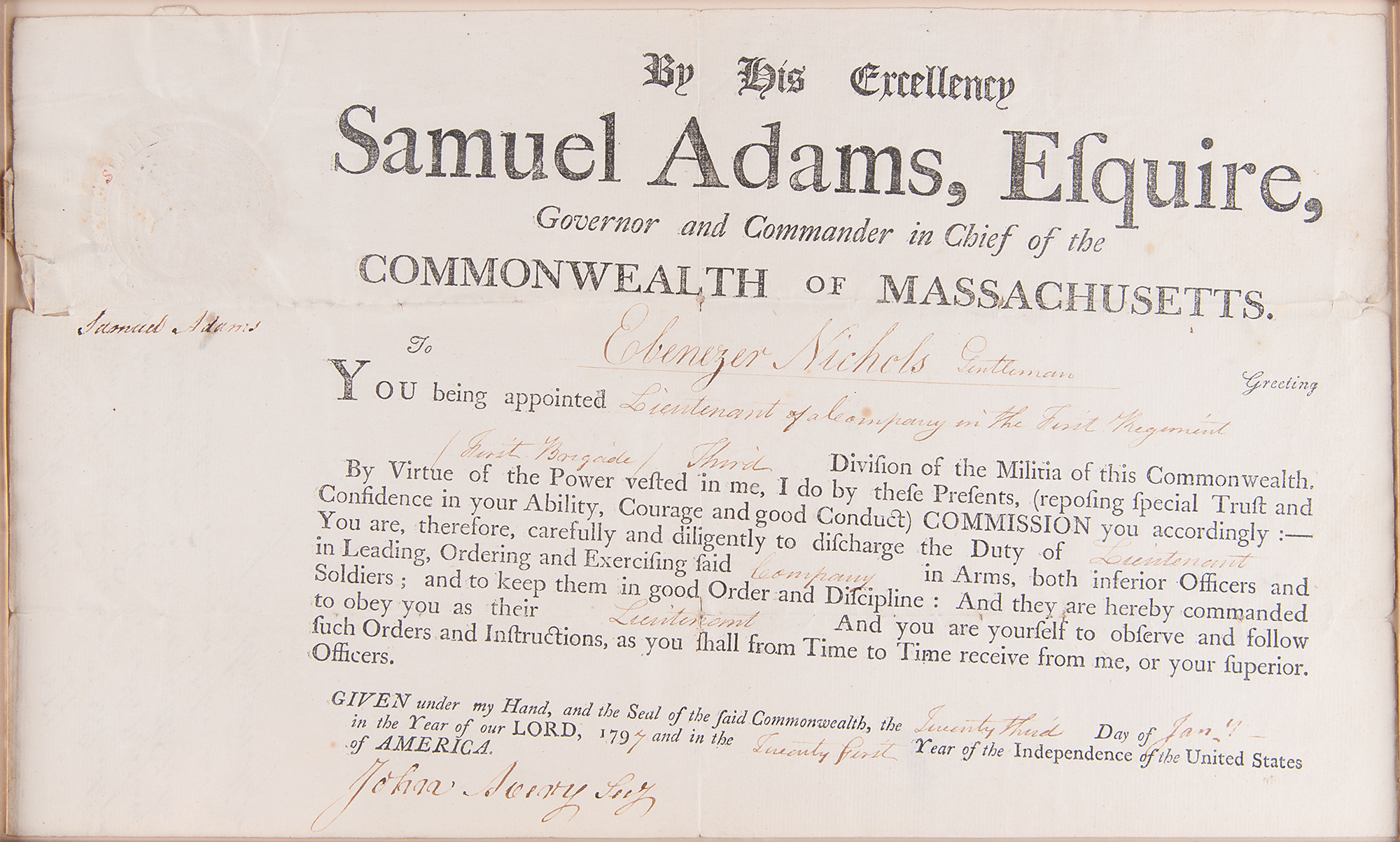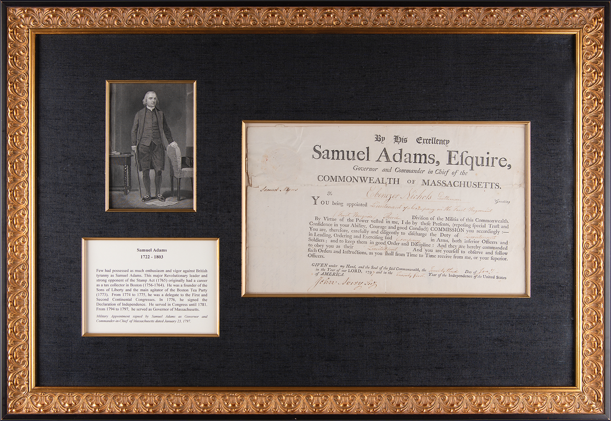 Sought-after partly-printed DS, signed “Samuel Adams,” one page, 14.5 x 8.75, January 23, 1797. As governor of Massachusetts, Samuel Adams appoints Ebenezer Nichols as "Lieutenant of a Company in the First Regiment, (First Brigade), Third Division, of Militia of this Commonwealth." Neatly signed in the upper left, below the embossed seal of Massachusetts, by Governor Samuel Adams, and countersigned at the conclusion by Secretary John Avery. Gorgeously cloth-matted and framed with an engraved portrait and biographical caption to an overall size of 32 x 22.5. In fine condition, with a tiny stain touching one letter of the signature. An ideal, boldly signed military document from the Revolutionary leader.