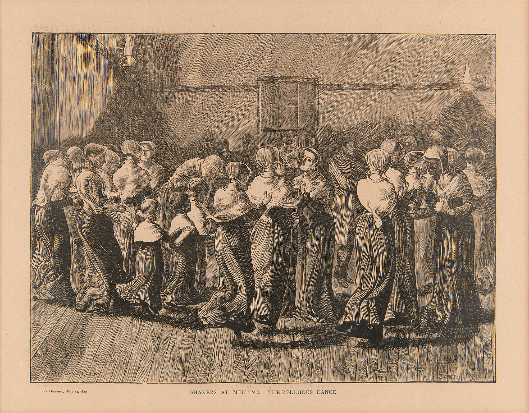 Handsome 13.25 x 10.25 engraving entitled "Shakers at a Meeting. The Religious Dance," after Arthur Boyd Houghton, engraved by Joseph Swain, removed from The Graphic (Vol. I, May 14, 1870). Nicely matted and framed to an overall size of 21.75 x 17.75. In fine condition.