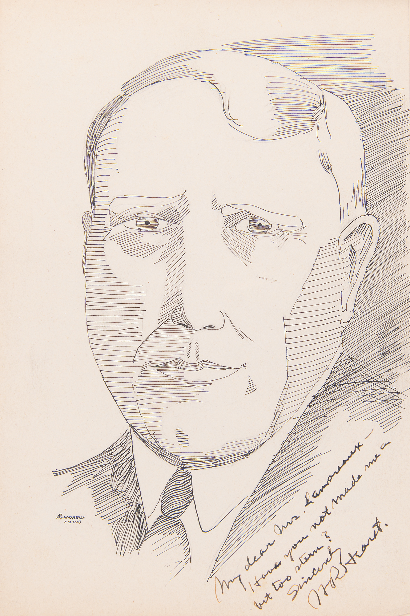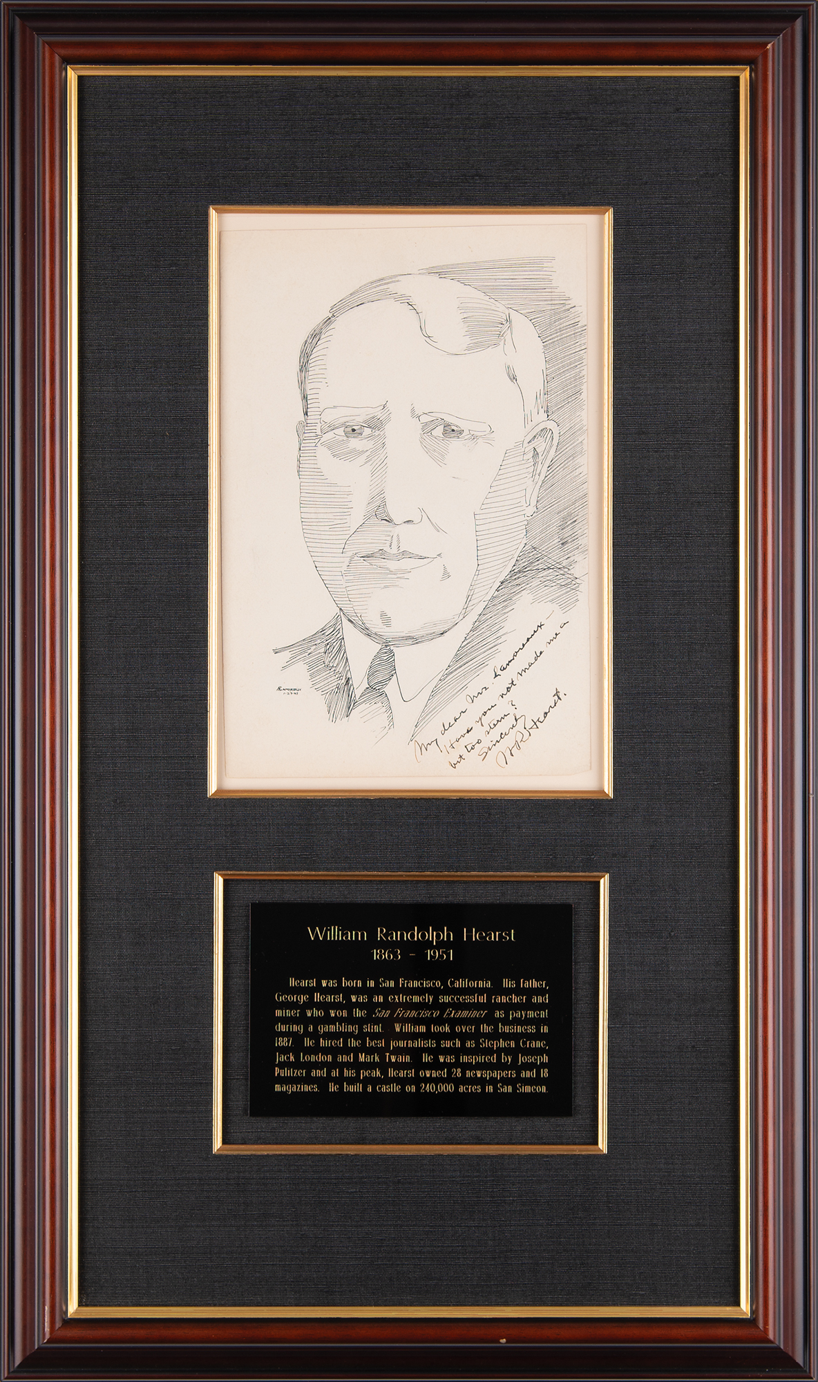 Amateur artist's original pen-and-ink sketch of colorful newspaper magnate William Randolph Hearst on an off-white 6.75 x 10.25 sheet, humorously signed and inscribed in the lower corner in fountain pen, "My dear Mr. Lamoreaux, Have you not made me a bit too stern? Sincerely, W. R. Hearst." Also signed by the artist in the lower left corner. Attractively cloth-matted and framed with a plaque to an overall size of 15.5 x 26. In fine condition.