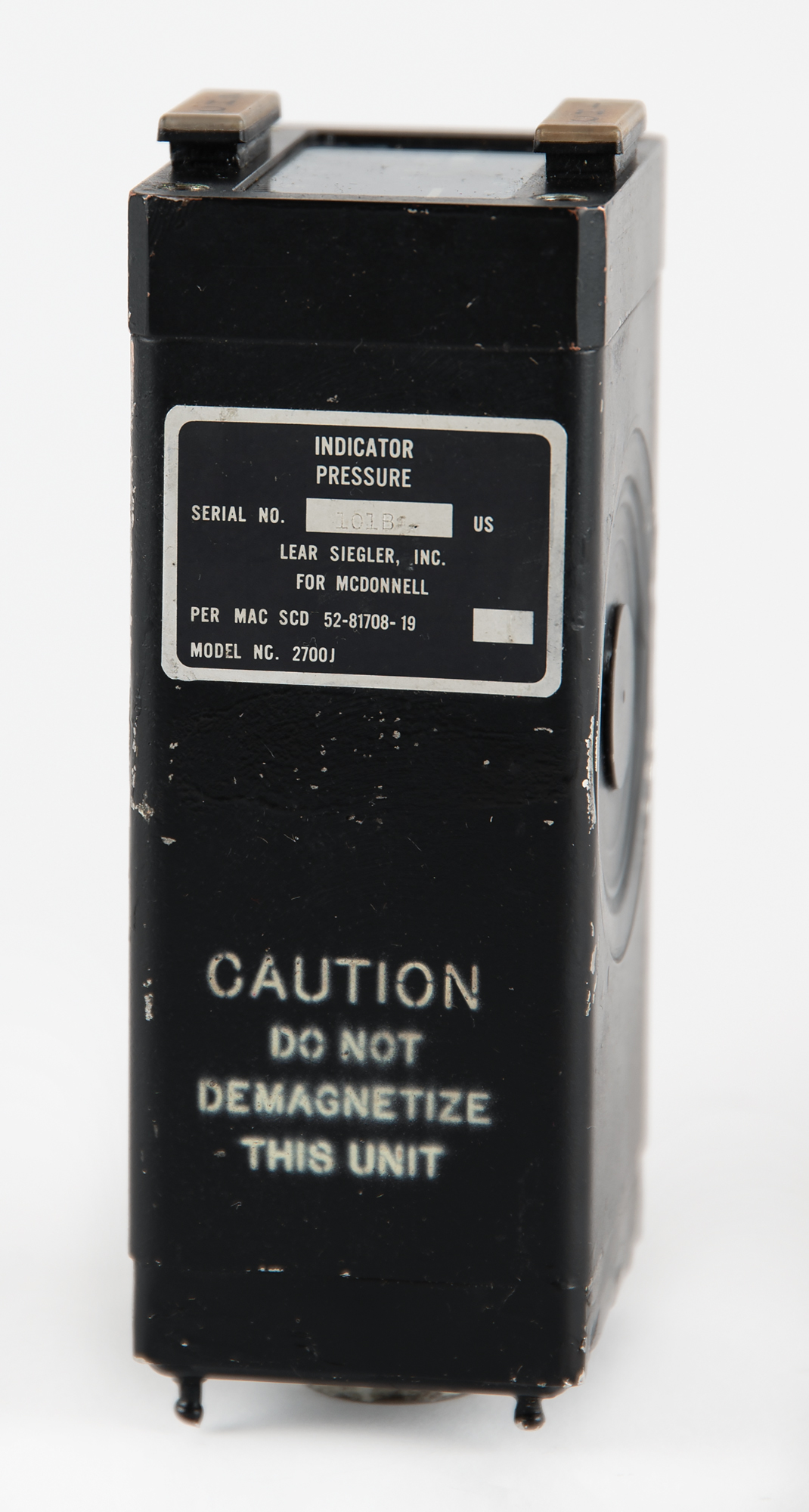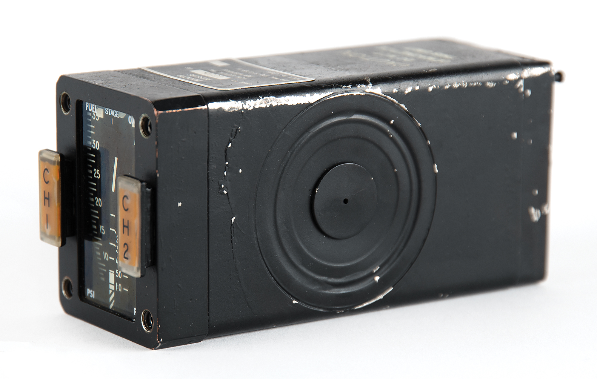 Stage 1 fuel/oxidizer indicator built for the Gemini spacecraft, measuring 2˝ x 2.5˝ x 6˝, with the manufacturer's tag on top: "Indicator, Pressure, Serial No. 101B US, Lear Siegler, Inc. for McDonnell, Per MAC SCD 52-81708-19, Model No. 2700J." The front indicator panel features dual meters, labeled "FUEL" and "OXID," with lighted "CH1" and "CH2" indicators. In fine condition.