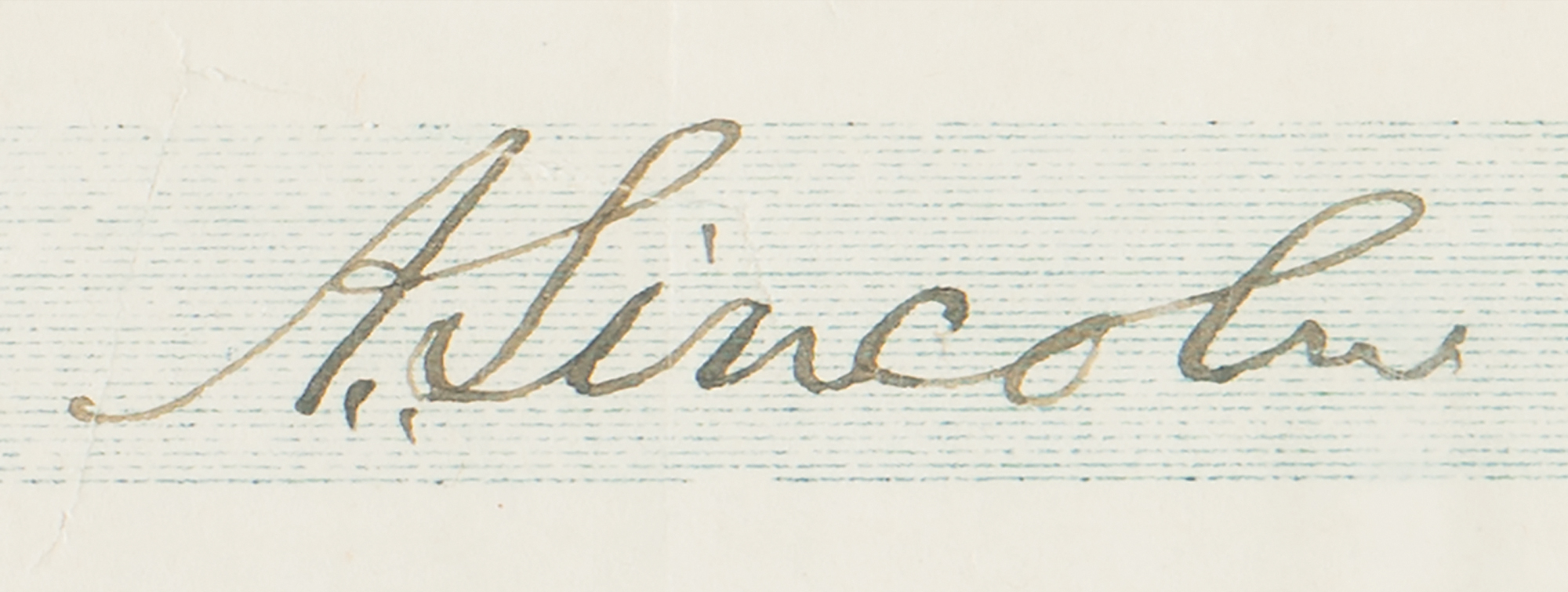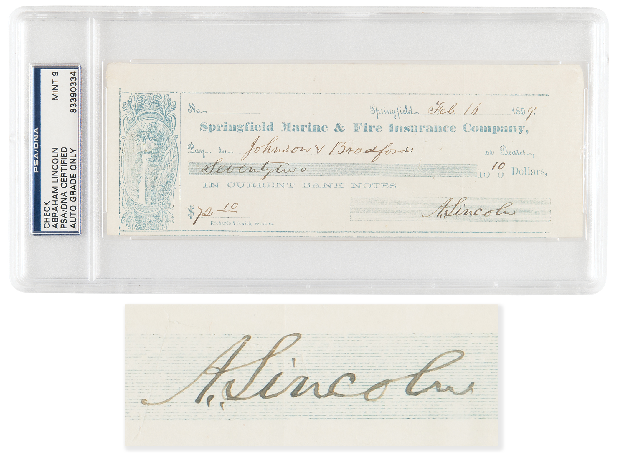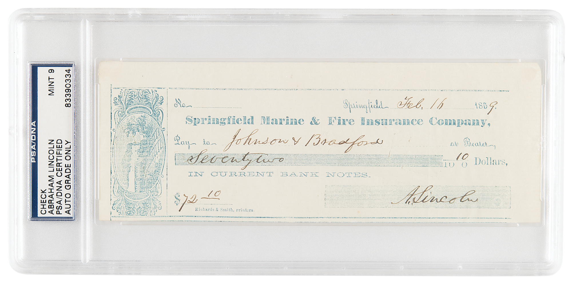 Highly desirable Springfield Marine and Fire Insurance Company check, 7.5 x 2.75, filled out and signed by Lincoln, "A. Lincoln," payable to Johnson & Bradford for $72.10, February 16, 1859. In very fine condition. Encapsulated and graded by PSA/DNA as "MINT 9."