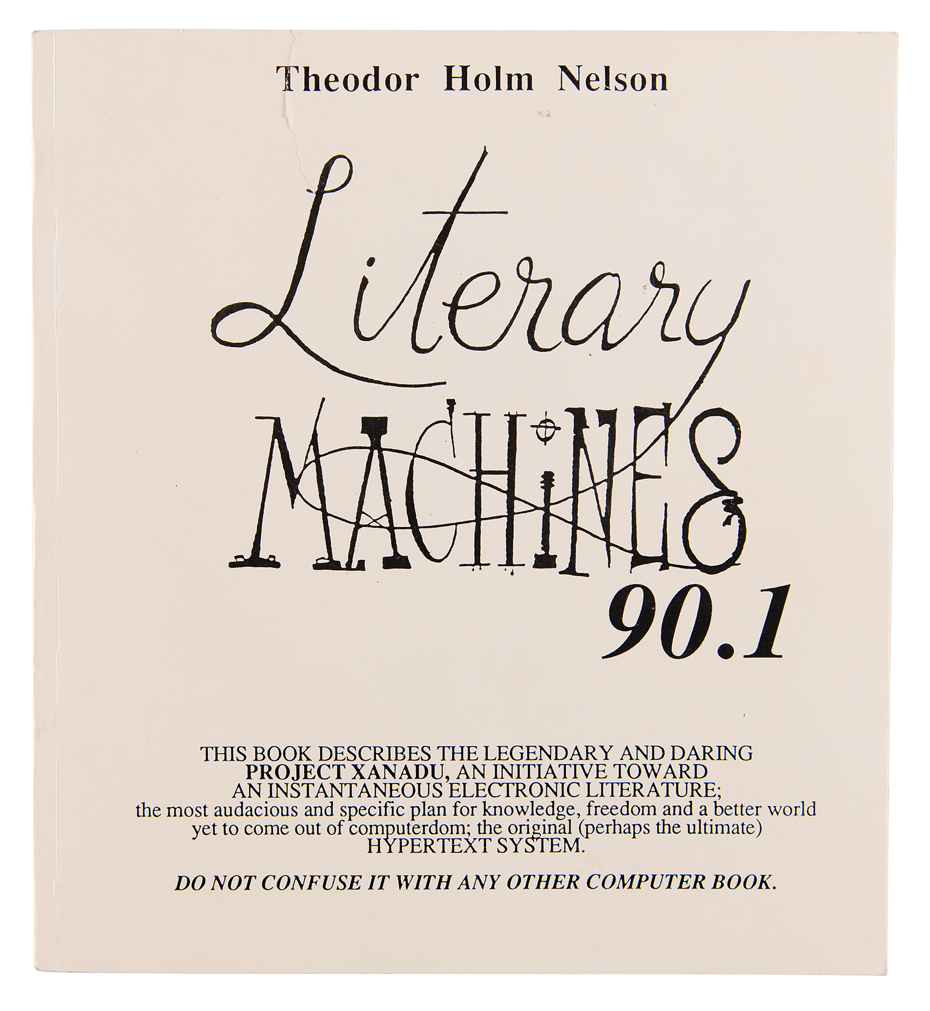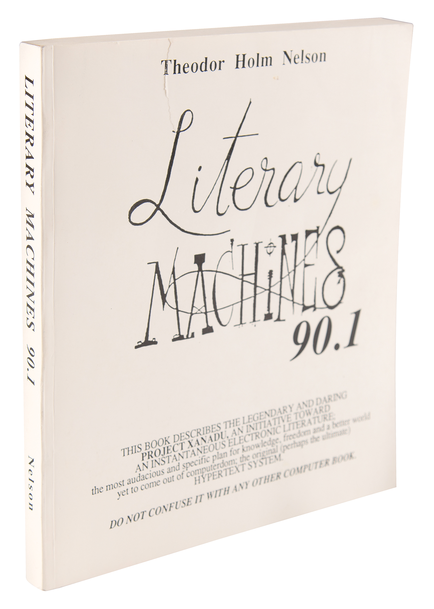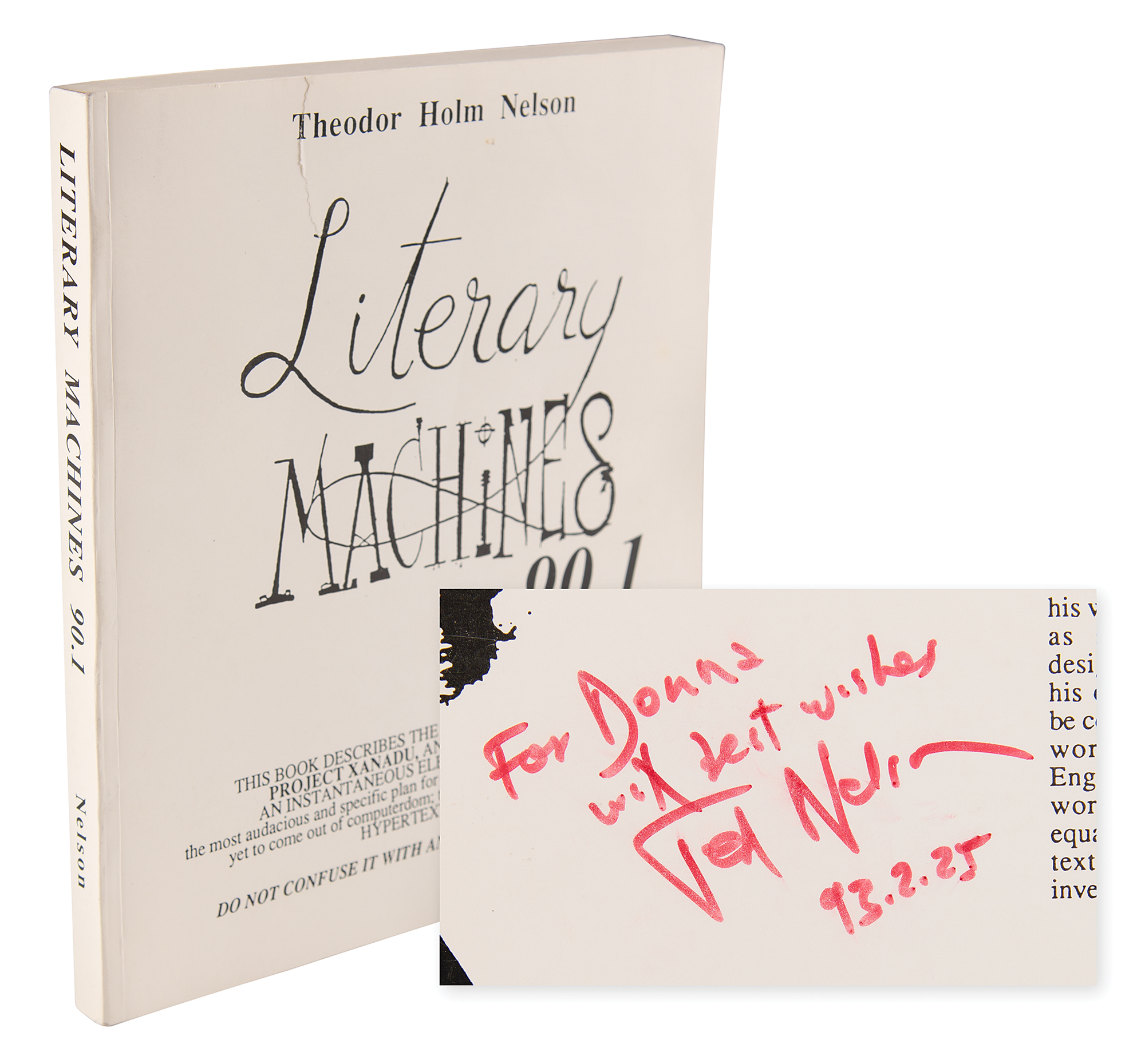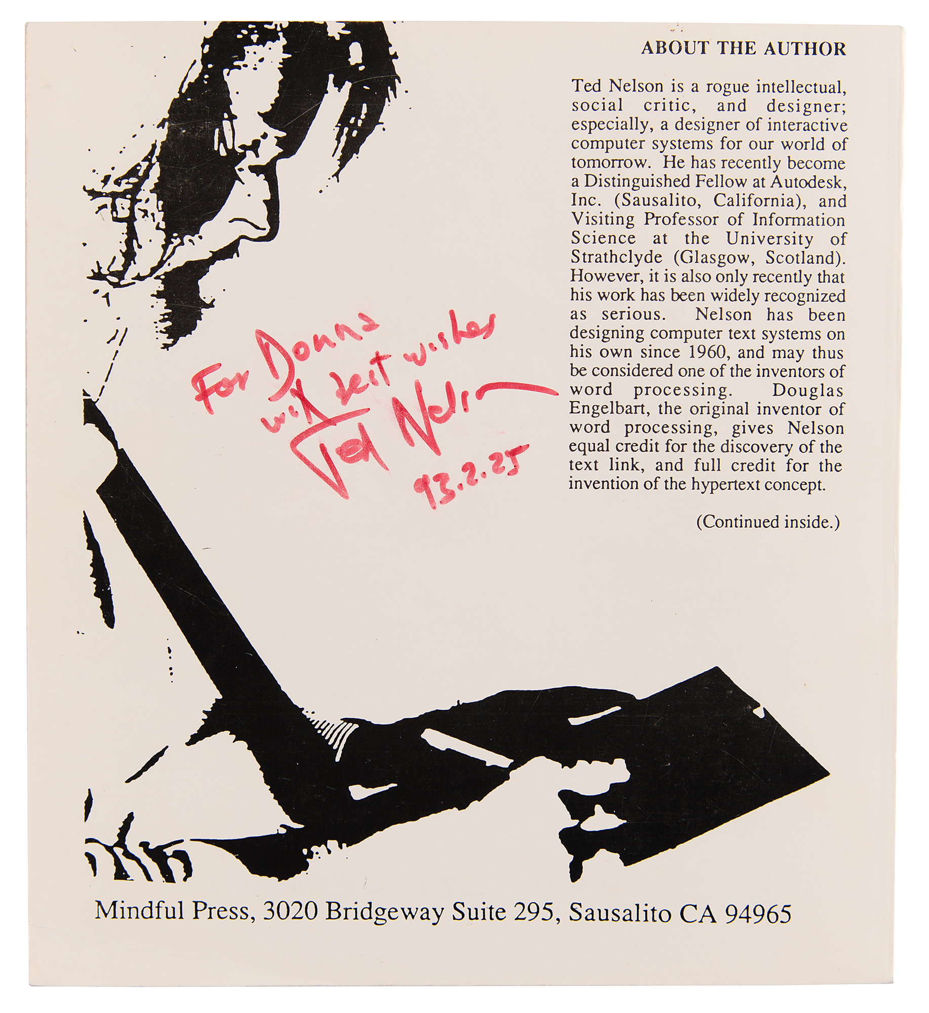 Signed book: Literary Machines, Edition 90.1 by Ted Nelson. Sausalito, CA: Mindful Press, 1990. Softcover, 7.75 x 8.5. Signed and inscribed on the back cover in red felt tip, "For Donna, with best wishes, Ted Nelson, 93.2.25." In very good to fine condition, with a tape-repaired edge tear to the cover.