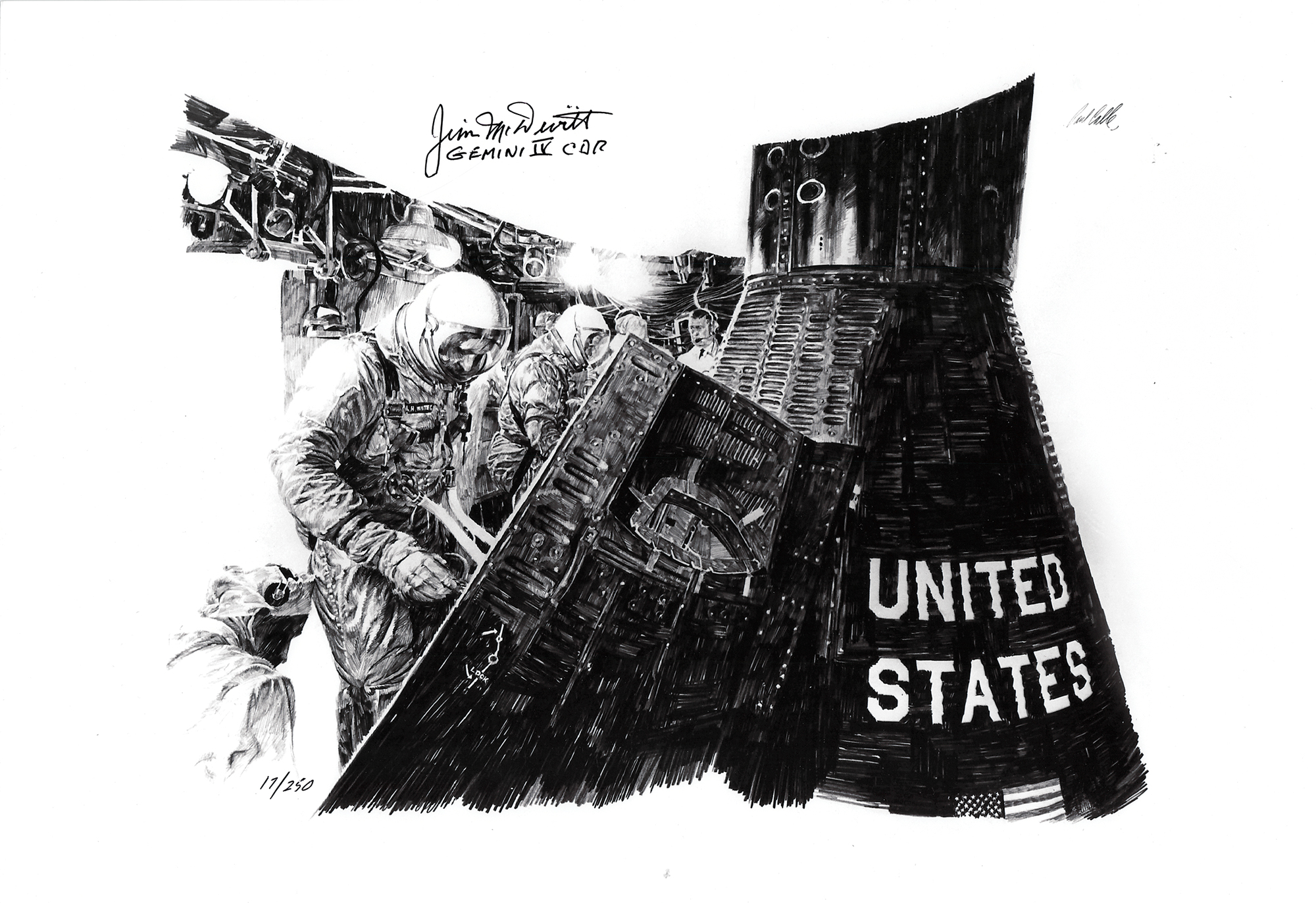 Limited edition 19 x 13 print of a sketch by Paul Calle showing McDivitt peering into the GT-4 capsule, numbered 17/250, boldly signed in black ink, "Jim McDivitt, Gemini IV CDR." Calle's signature is preprinted in the upper right corner. In very fine condition.