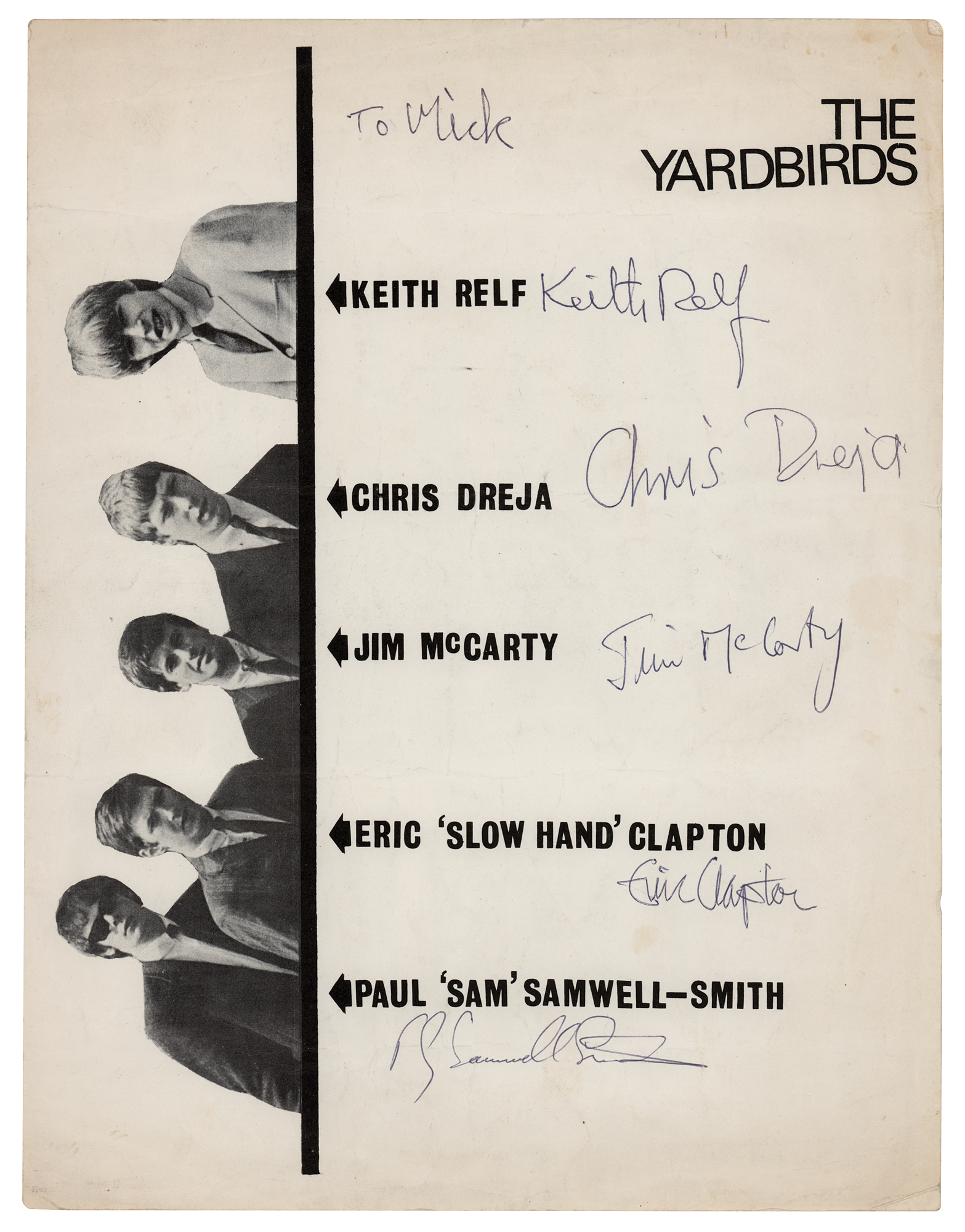 Rare vintage 8.5 x 11 paperstock promotional photo of The Yardbirds, featuring a vertical image of the band on the left side, signed and inscribed by each pictured musician next to their respective printed names in black ballpoint, "To Mick, Keith Relf," "Chris Dreja," "Jim McCarty," "Eric Clapton," who is referred to as 'Slow Hand,' and "P. G. Samwell-Smith." In very good to fine condition, with light creasing and horizontal folds. An atypically large fully signed promo photo of The Yardbirds.
