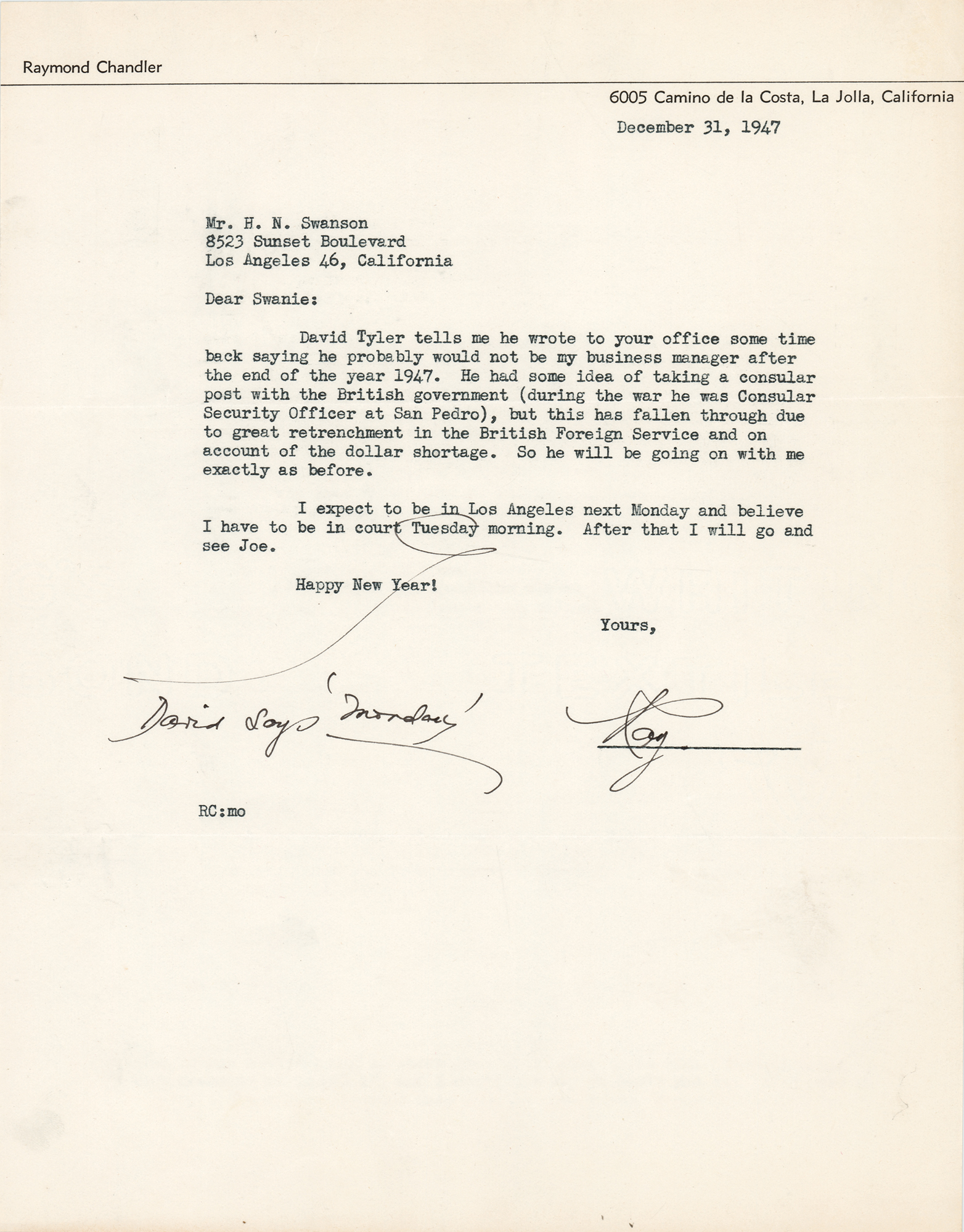 Influential detective novelist (1888–1959) best known for The Big Sleep and The Long Goodbye. TLS signed “Ray,” one page, 8.5 x 11, personal letterhead, December 31, 1947. Letter to “Swanie,” his literary agent H. N. Swanson, in full: “David Tyler tells me he wrote to your office some time back saying he probably would not be my business manager after the end of the year 1947. He had some idea of taking a consular post with the British government (during the war he was Consular Security Officer at San Pedro), but this has fallen through due to great retrenchment in the British Foreign Service and on account of the dollar shortage. So he will be going on with me exactly as before. I expect to be in Los Angeles next Monday and believe I have to be in court Tuesday morning. After that I will go and see Joe. Happy New Year!” Next to his signature, Chandler writes in his own hand: “Davis says ‘Monday.’” In fine condition.