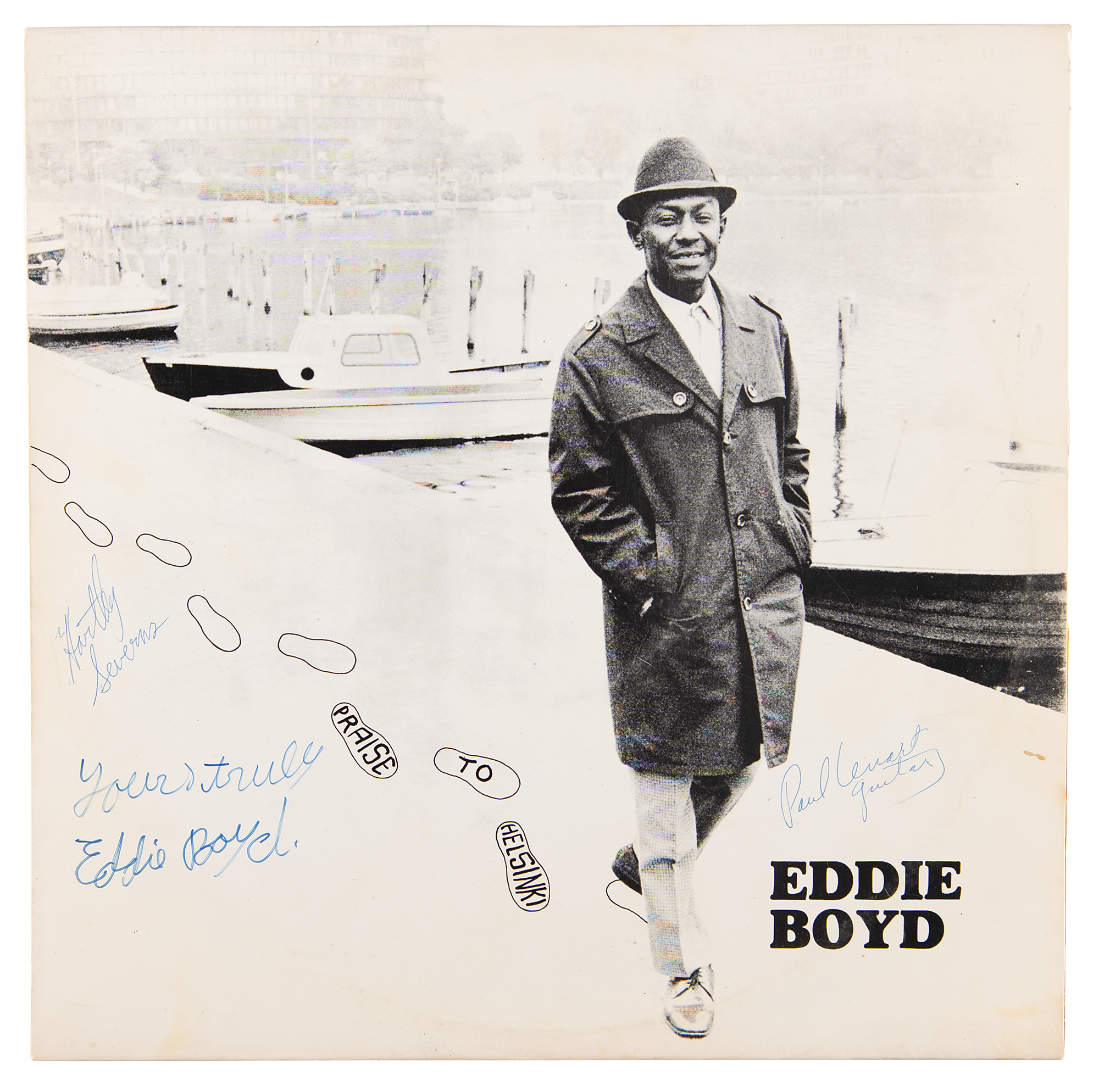 Scarce Praise to Helsinki album by Eddie Boyd, signed on the front cover in blue felt tip, “Yours truly, Eddie Boyd.” The front and back covers are also signed by notable blues players T-Bone Walker, Vinton Johnson, Hartley Severns, Eddie Taylor, and Paul Lenart. In fine condition, with some stains on the back cover. The record is not included.