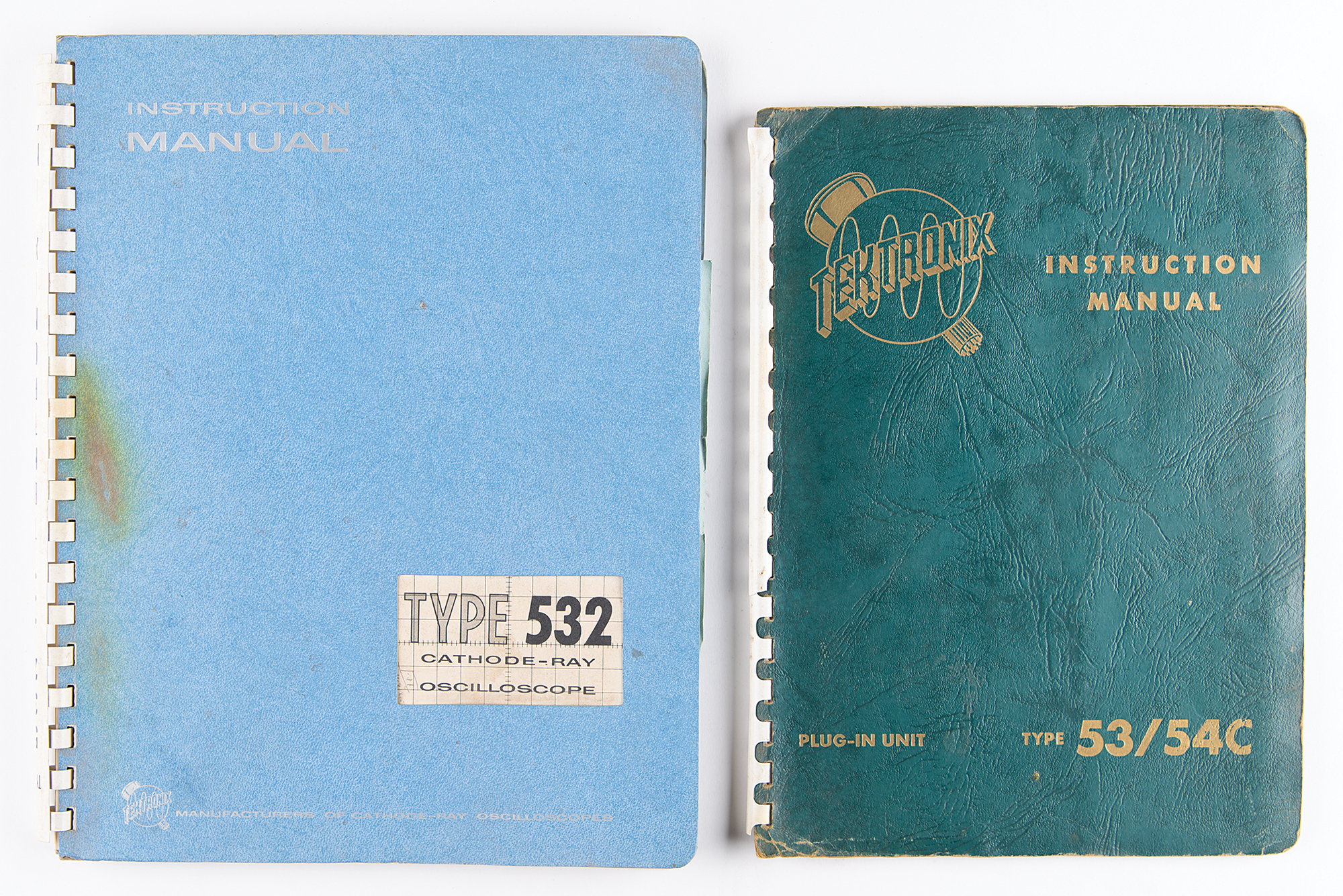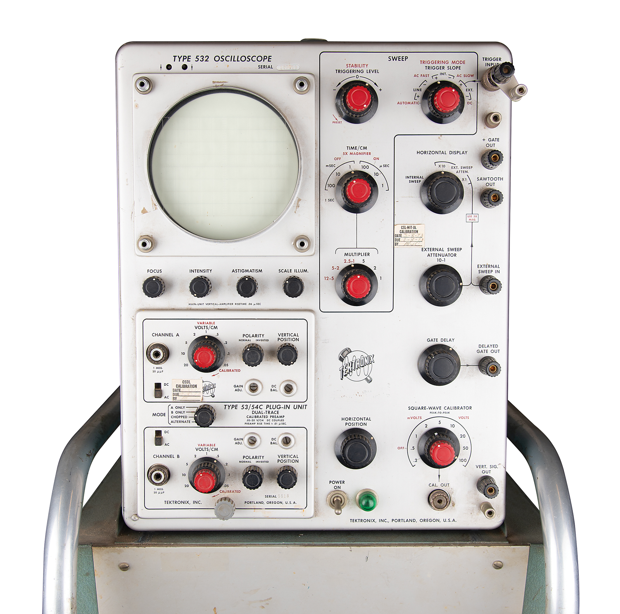 Large Tektronix Type 532 oscilloscope used for testing at the MIT Instrumentation Lab during Apollo and on the F-8 digital fly-by-wire project, serial no. 007012, measuring 13˝ x 16.5˝ x 22˝, bearing an affixed CSL-MIT-DL calibration label dated 1973. Complete with a Tektronix Type 500 'Scope-Mobile' rolling cart, with two instruction manuals held within its drawer.