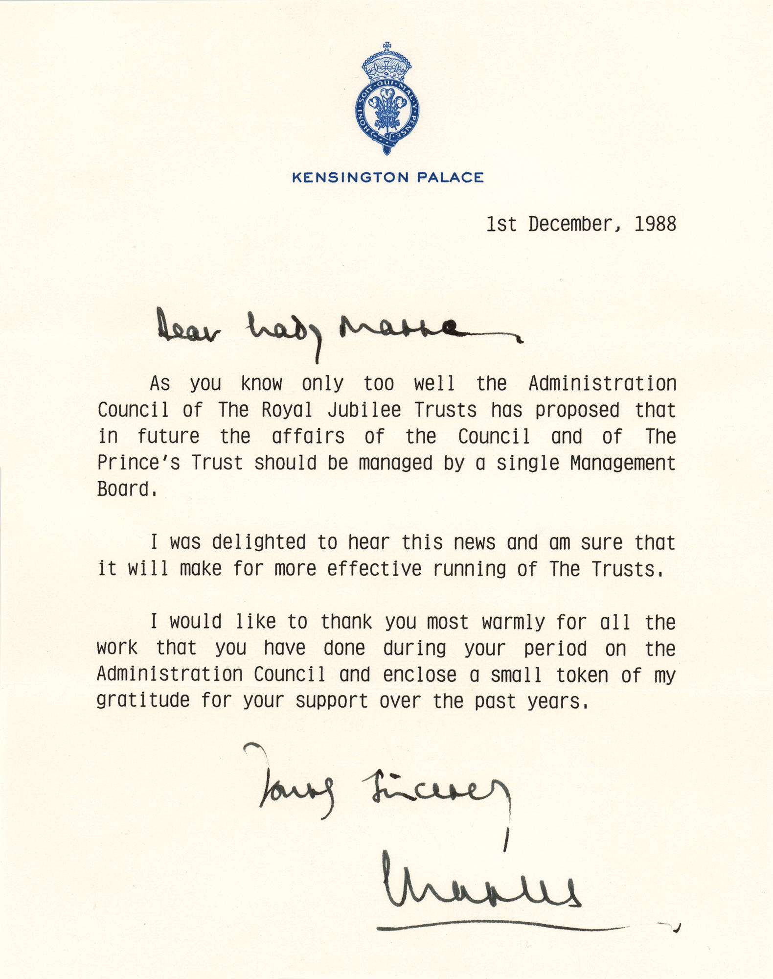 TLS signed “Yours sincerely, Charles,” one page, 7.25 x 9.25, Kensington Palace letterhead, December 1, 1988. Letter to Lady Marre, in full: "As you know only too well the Administration Council of The Royal Jubilee Trusts has proposed that in future the affairs of the Council and of The Prince's Trust should be managed by a single Management Board. I was delighted to hear this news and am sure that it will make for more effective running of The Trusts. I would like to thank you most warmly for all the work that you have done during your period on the Administration Council and enclose a small token of my gratitude for your support over the past years." In fine condition. Accompanied by the original mailing envelope.