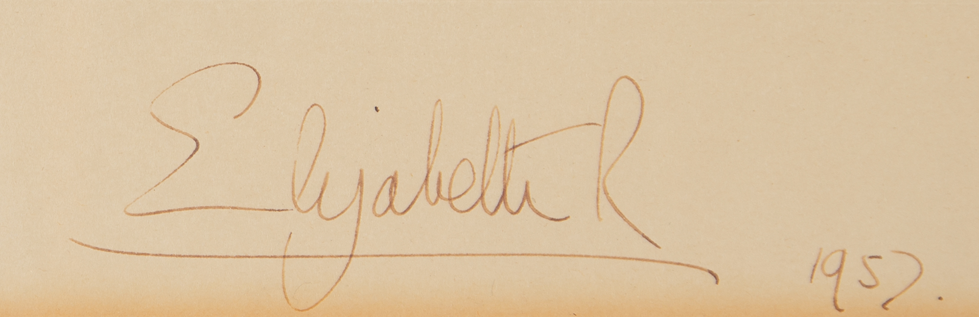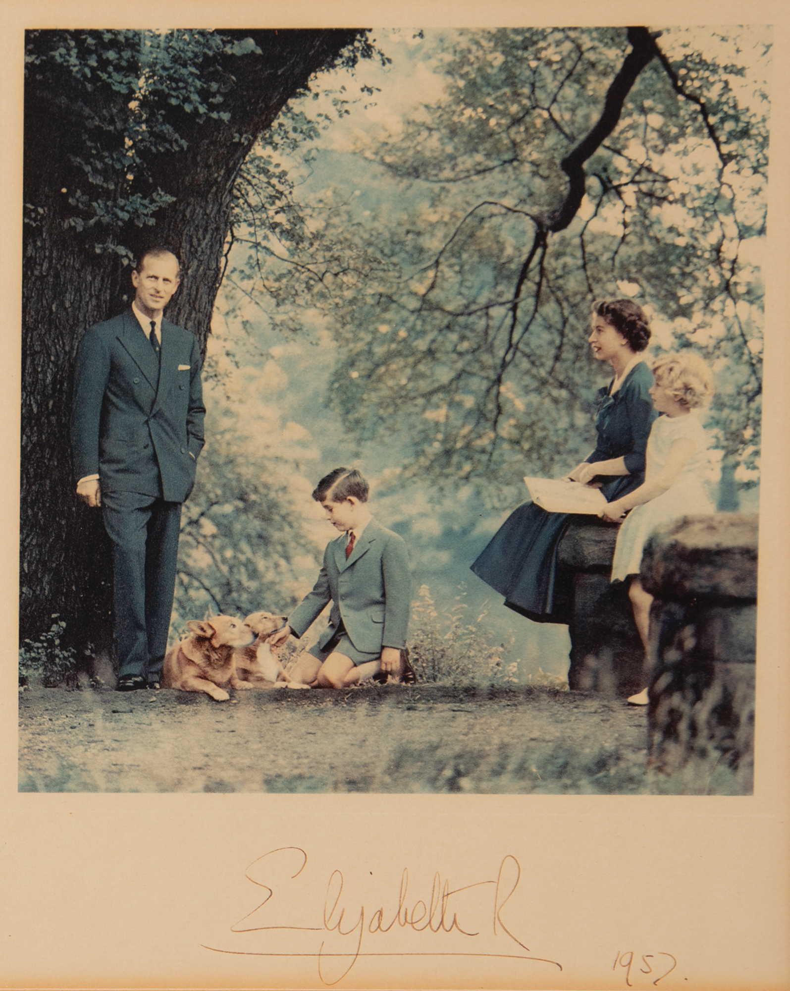 Color 7 x 8.75 print of Queen Elizabeth II relaxing on a stone wall with her family—the royal corgis included—signed in the lower border in fountain pen, "Elizabeth R, 1957." Handsomely matted and framed to an overall size of 11.75 x 13.5. In fine condition.