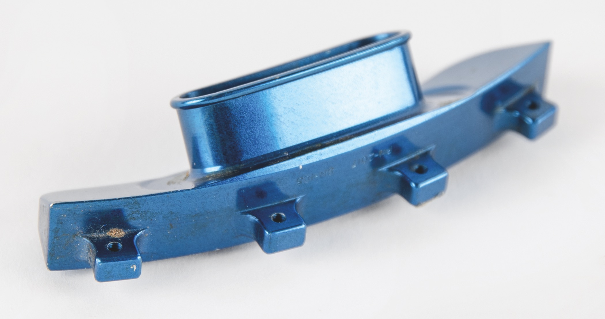 Apollo-era helmet ventilation port for a spacesuit neck ring, 3.75˝ x 1˝ x 1˝, constructed of blue anodized aluminum and a rubber seal. Parts number to the underside reads: “PN-2017, SN-105.” In fine condition.