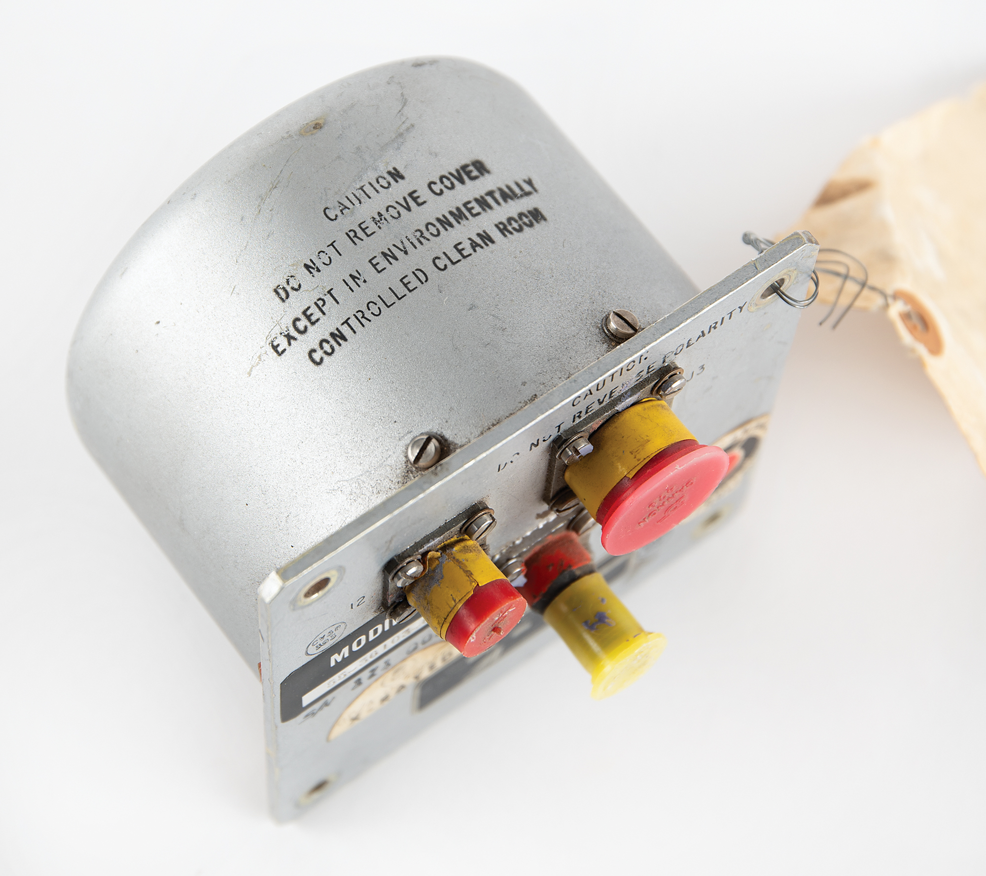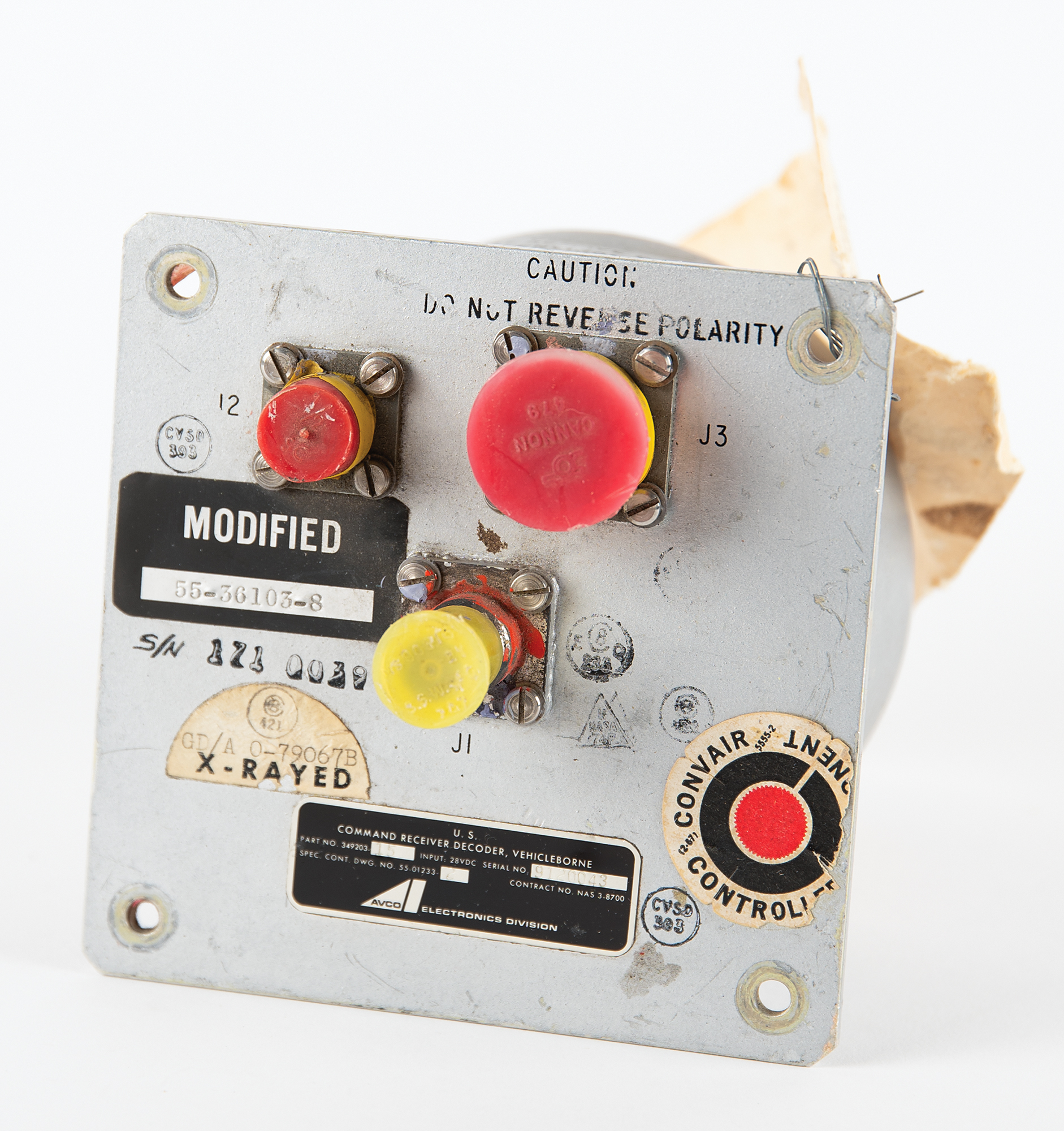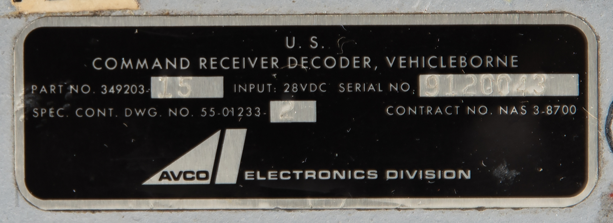 Vehicleborne Command Receiver Decoder built by Avco under contract with the NASA Lewis Research Center, measuring 4.5˝ x 4.5˝ x 3˝, with an Avco Electronics Division label on the front: "U.S. Command Receiver Decoder, Vehicleborne, Part No. 349203-15, Serial No. 9120043, Spec. Cont. Dwg. No. 55-01233-2, Contract No. NAS 3-8700." A General Dynamics Space Systems Division delivery order tag remains attached.