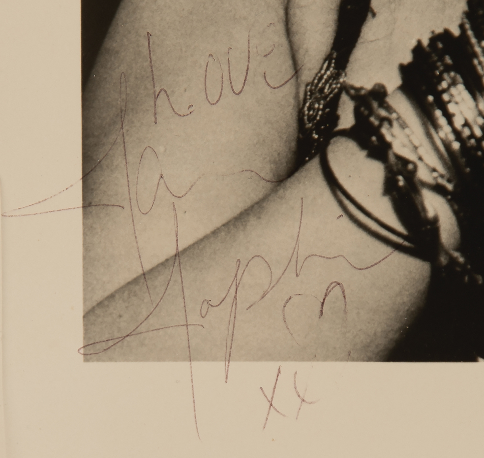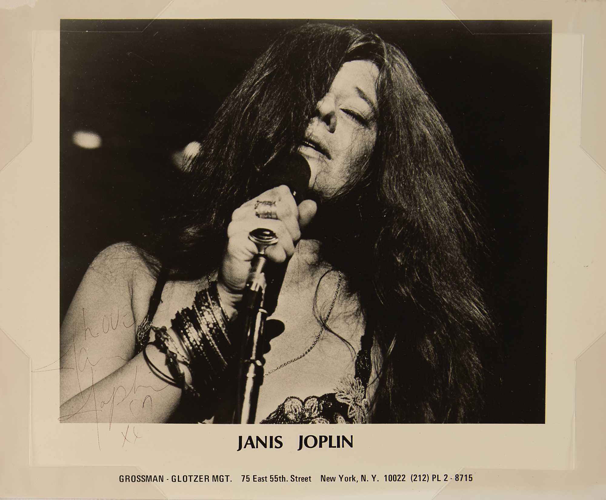 Vintage glossy 10 x 8 Grossman-Glotzer Management promo photo of Joplin mid-performance, signed in black ballpoint, "Love, Janis Joplin, xx." In fine condition, with scattered light creasing and tiny surface impressions. Archivally corner-mounted, matted, and framed under Tru Vue Museum Glass to an overall size of 18 x 16. Accompanied by a certificate of authenticity from Tracks and a full letter of authenticity from REAL.