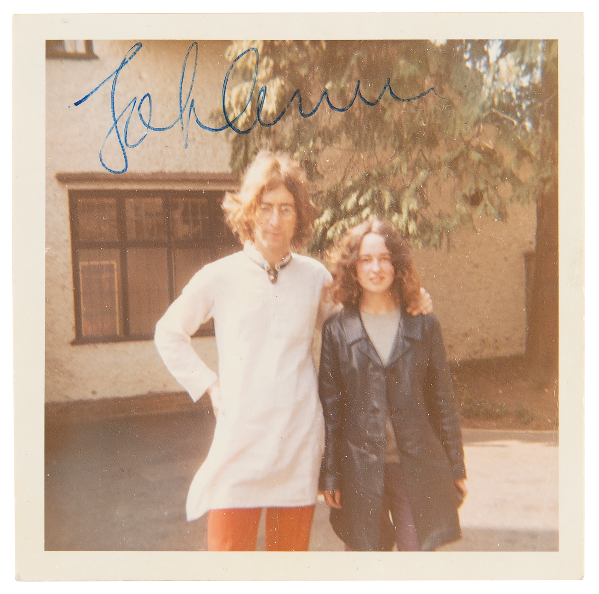 Vintage color glossy 3.5 x 3.5 candid photo of John Lennon posing with a female fan at his Weybridge, Surrey home, ‘Kenwood,’ in the spring of 1968, signed in bold blue ballpoint. The consignor notes that the photograph was taken (and the autograph collected) by an avid Beatles fan who visited their respective homes on several occasions in the late 1960s; the fan recalled that ‘they were pretty relaxed about posing for photographs on their own front doorsteps. The first time one of The Beatles opened their door I nearly fainted.' Reverse is stamp-dated to April 1968. In fine condition, with slight surface impressions from another item that Lennon signed on top of this one. Accompanied by a certificate of authenticity from Tracks.