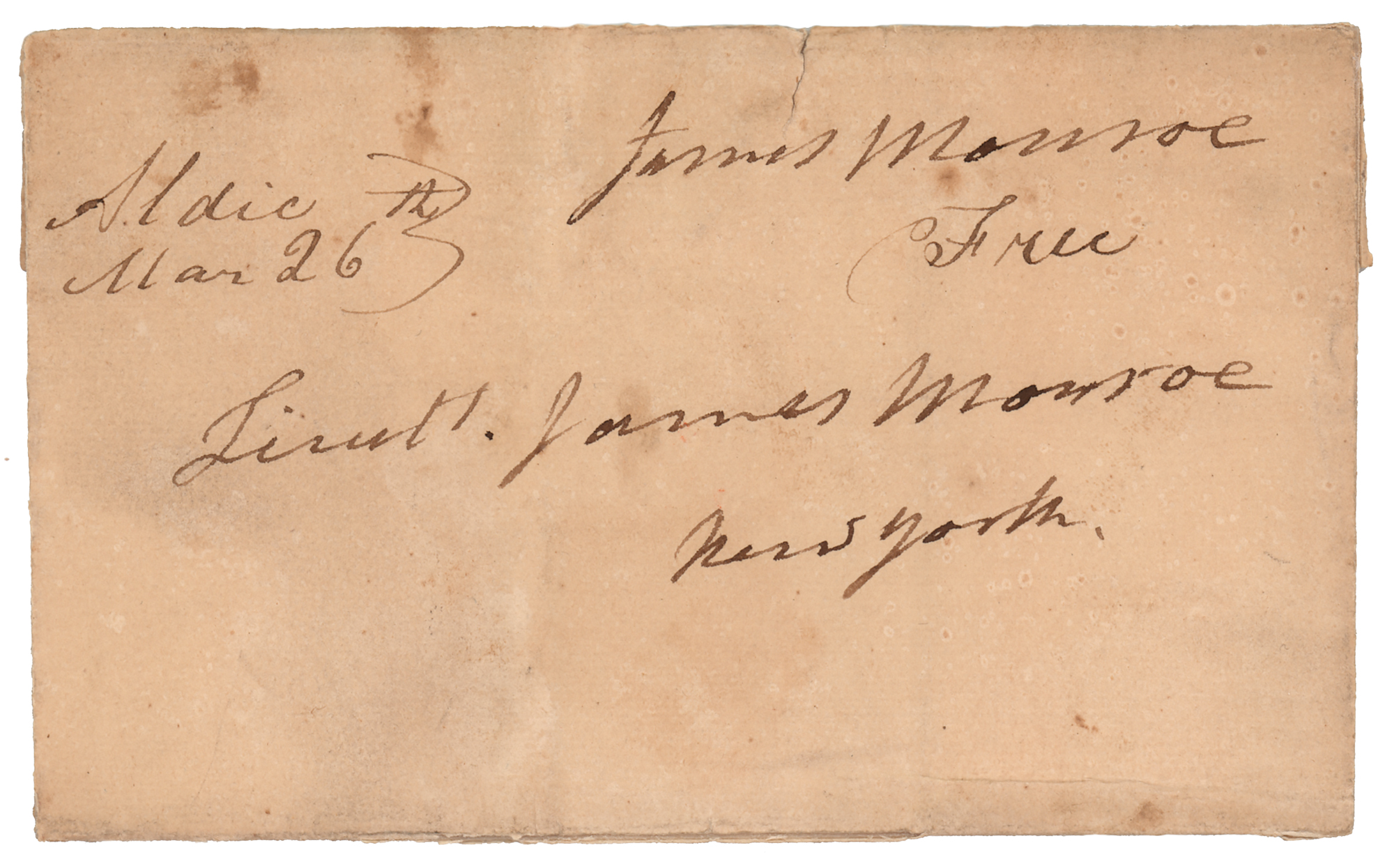 Desirable hand-addressed full free frank, measuring 9.75 x 8 unfolded, with central panel measuring 5.5 x 3.5, addressed by Monroe to his nephew, "Lieut. James Monroe, New York," and franked in the upper right corner, "James Monroe." Dated March 26, [no year]. In very good to fine condition, with scattered light staining and soiling, and a short tear to the top edge impinging on, but not touching, the signature. A unique piece of familial correspondence, effectively carrying two signatures of the Founding Father.