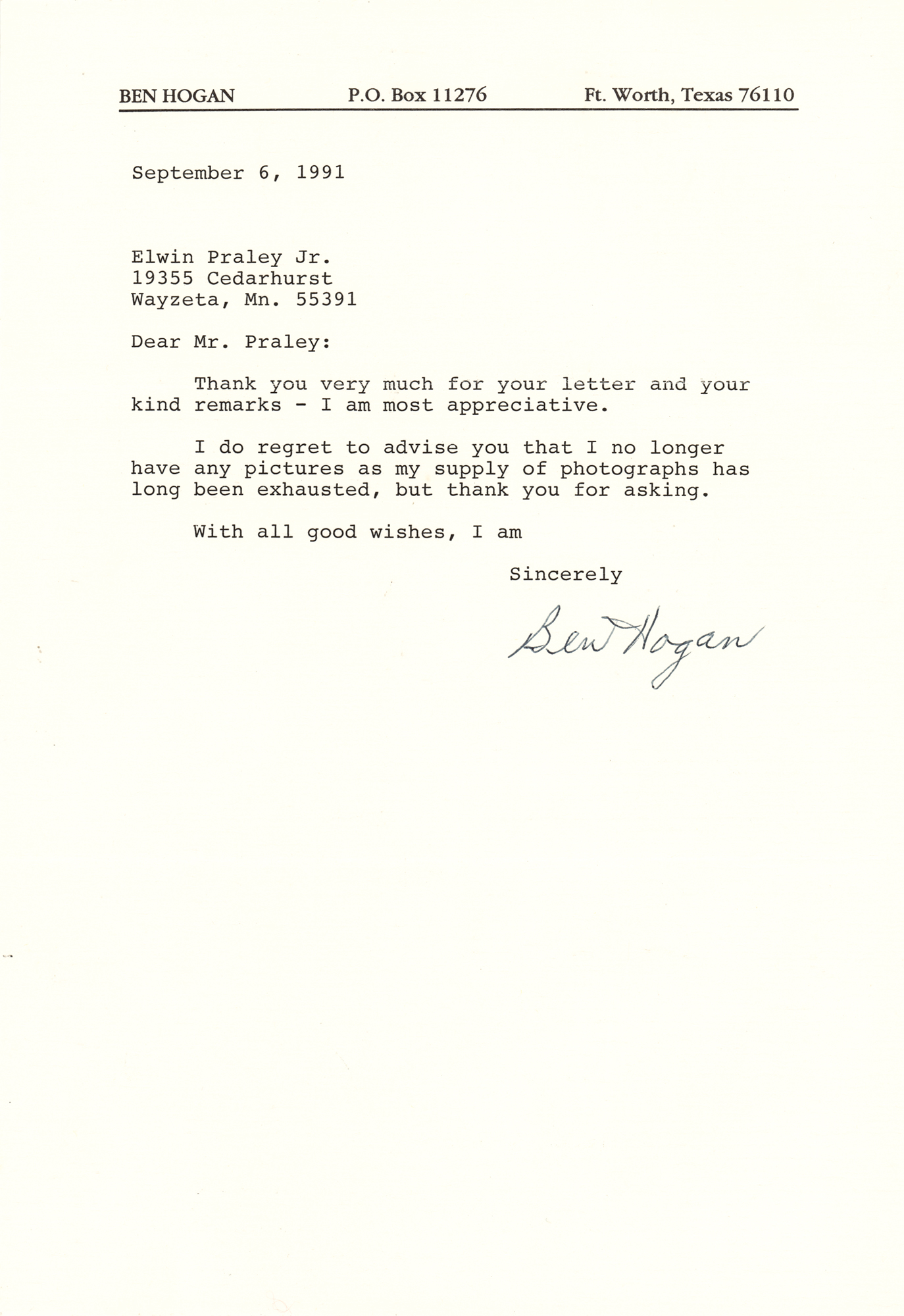 TLS, one page, 7.25 x 10.5, September 6, 1991. Letter responding to an admirer, in part: "Thank you very much for your letter and your kind remarks—I am most appreciative…I no longer have any pictures as my supply of photographs has long been exhausted." In fine condition.
