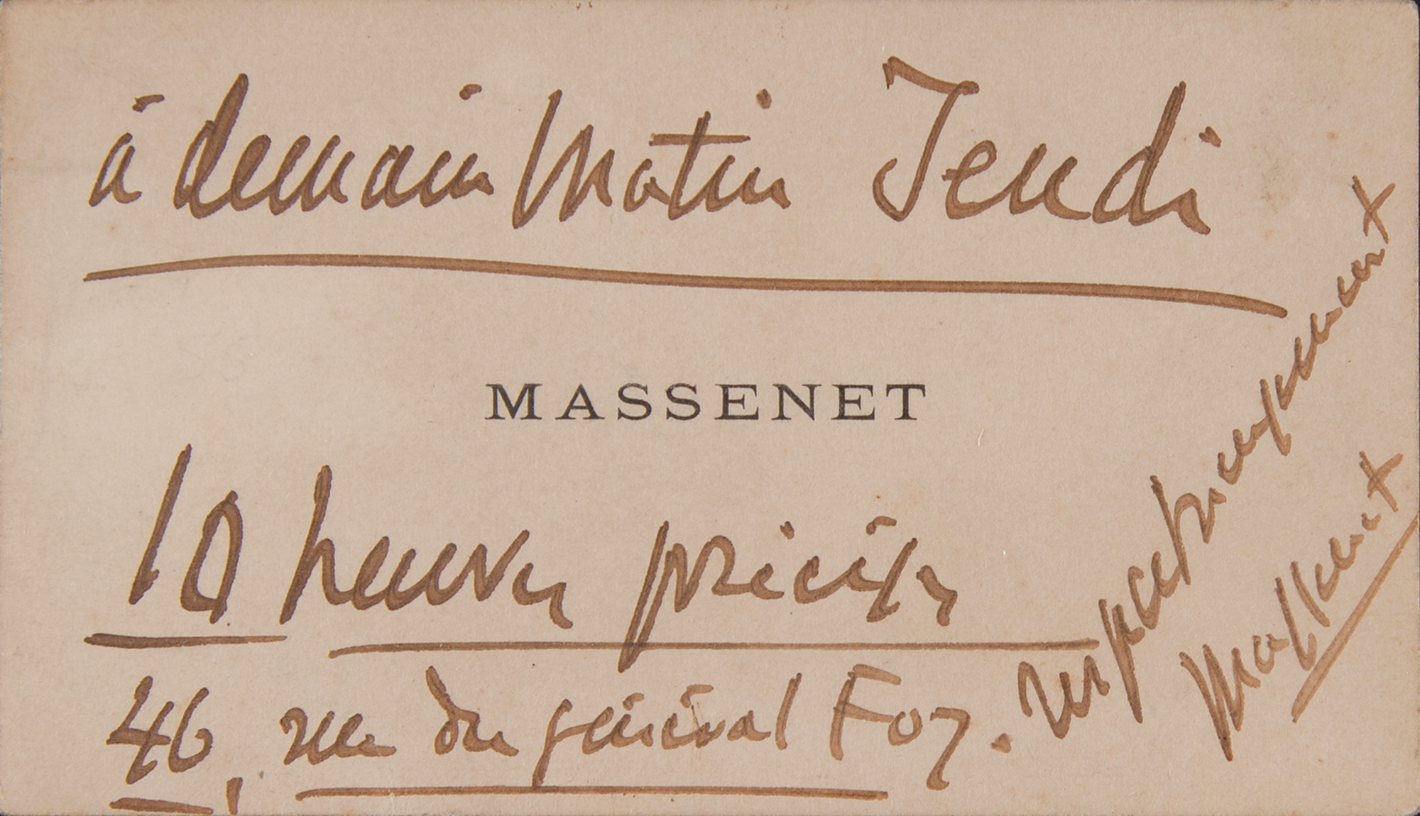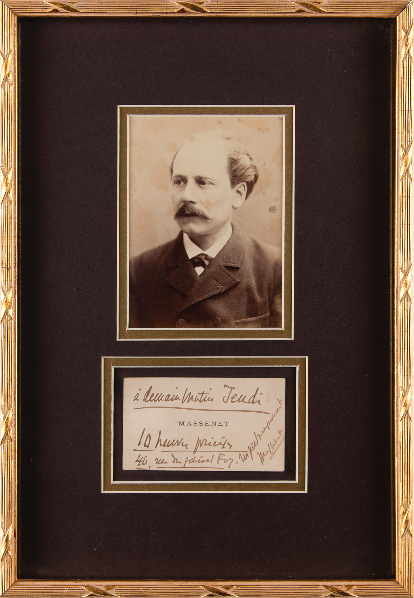 Personal calling card imprinted with his surname, 4 x 2.5, signed in ink, "Massenet," with several other words in his handwriting. Mounted, double-matted, and framed with a portrait to an overall size of 10.25 x 15. In fine condition, with staining to the image.