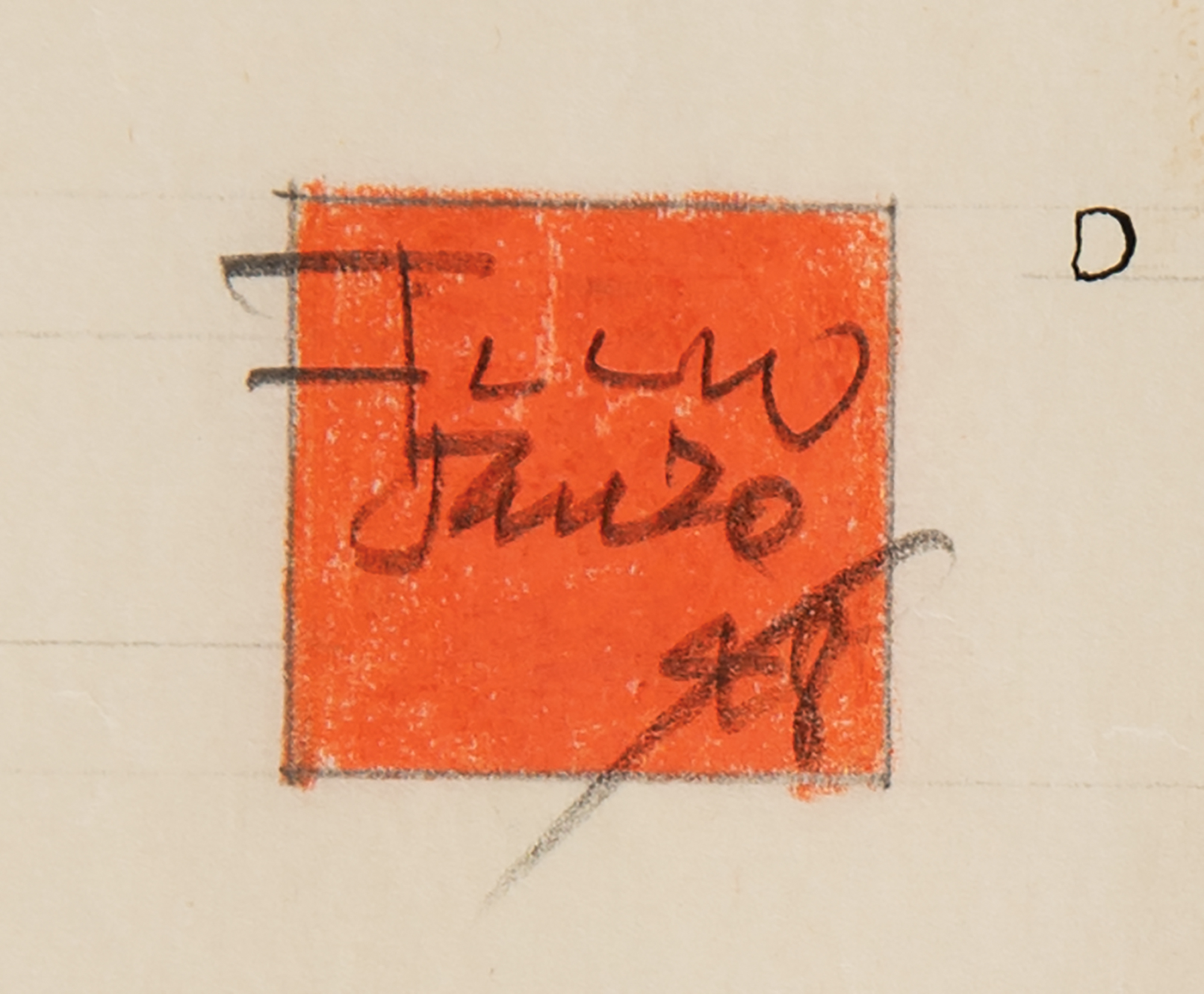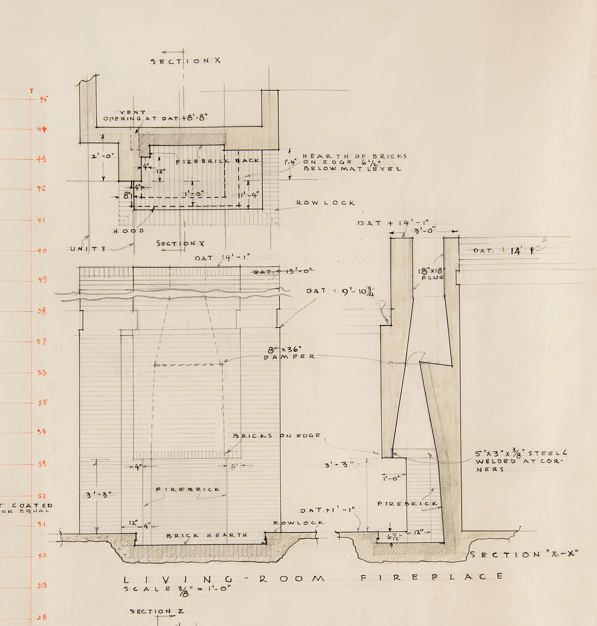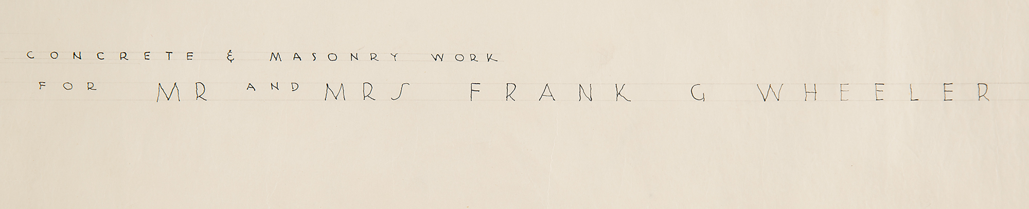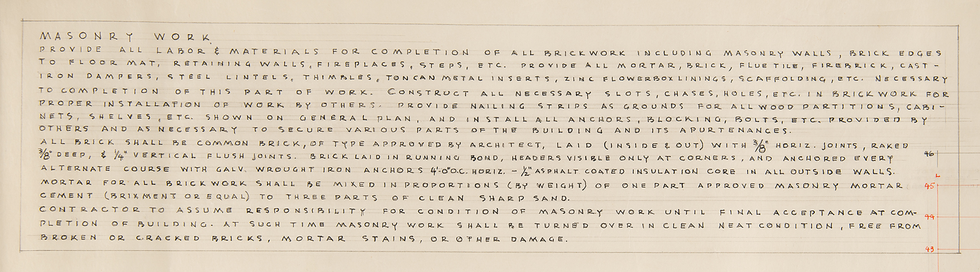 Hand-drawn design of the "Usonian House for Mr. and Mrs. Frank G. Wheeler" in Hinsdale, Illinois, executed under Wright's oversight at his studio, one page, 36 x 30, with the inside of the hand-drawn red 'Taliesen' box at the bottom signed in pencil by Frank Lloyd Wright, "FLLW, Jan. 20/48." Accomplished in ink, graphite, and colored pencil, and identified as "Sheet 3, Mat Plan, Concrete & Masonry Work," the plan shows a detailed overhead view of the house, identifying the terrace, living room, bedrooms, shop, bathroom, carport, fireplaces, chimneys, and other areas, all labeled with comprehensive details pertaining to the concrete and masonry work involved in their creation. On the right side is a large cross-section of the "studio fireplace." At the top is a lengthy passage headed "Masonry Work," detailing the contractor's responsibilities for completing the work.