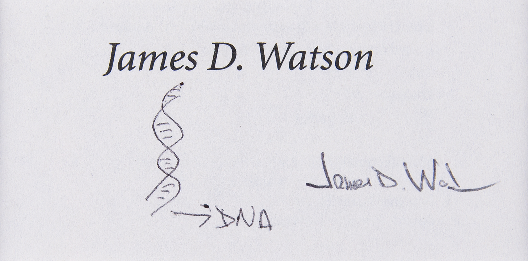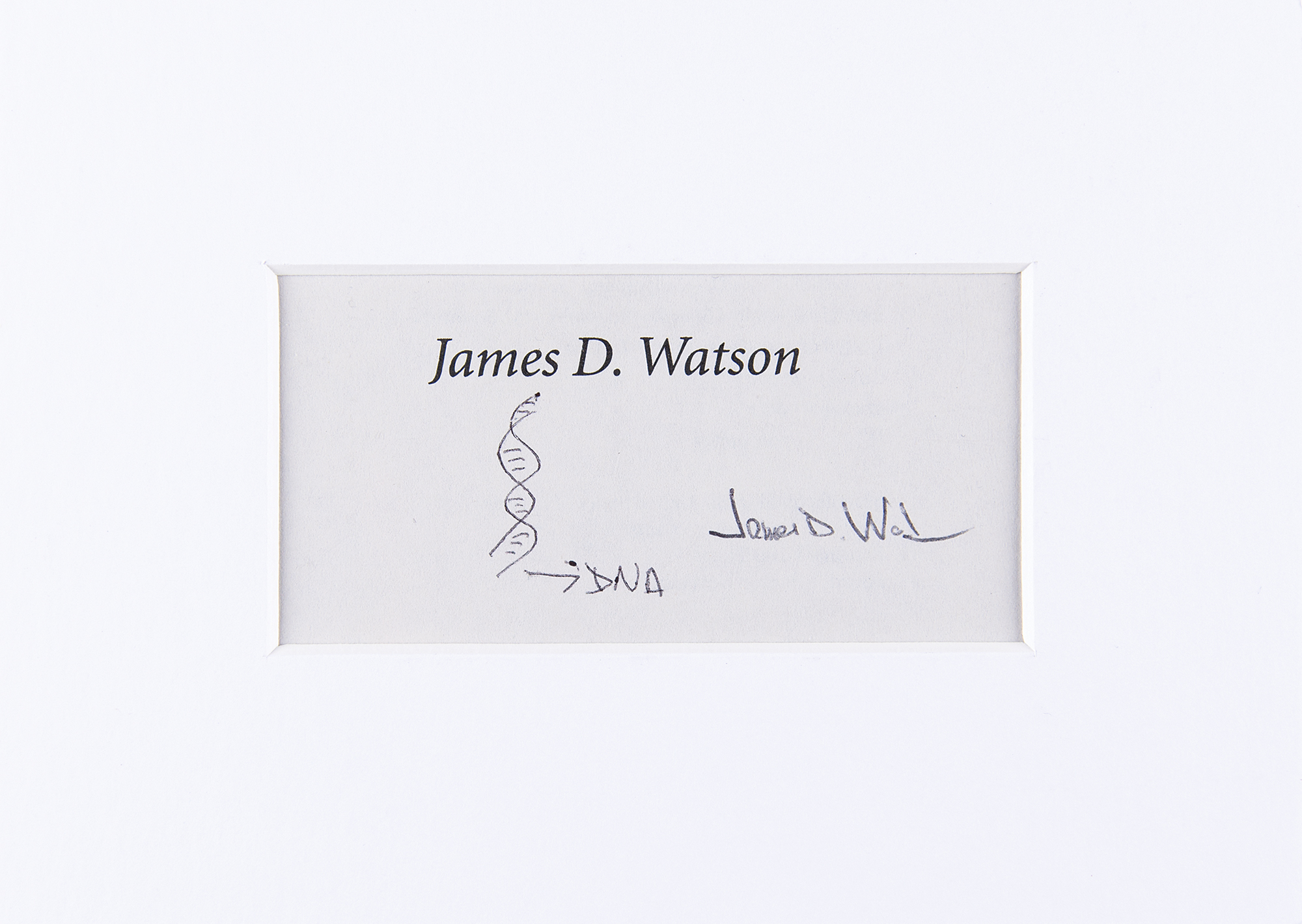 Ballpoint signature, "James D. Watson," adding a sketch of a double-helix strand of "DNA,” on an off-white 4 x 2 card. Matted to an overall size of 7 x 5. In very fine condition, with a JSA label affixed to the reverse. Accompanied by a certificate of authenticity from JSA.