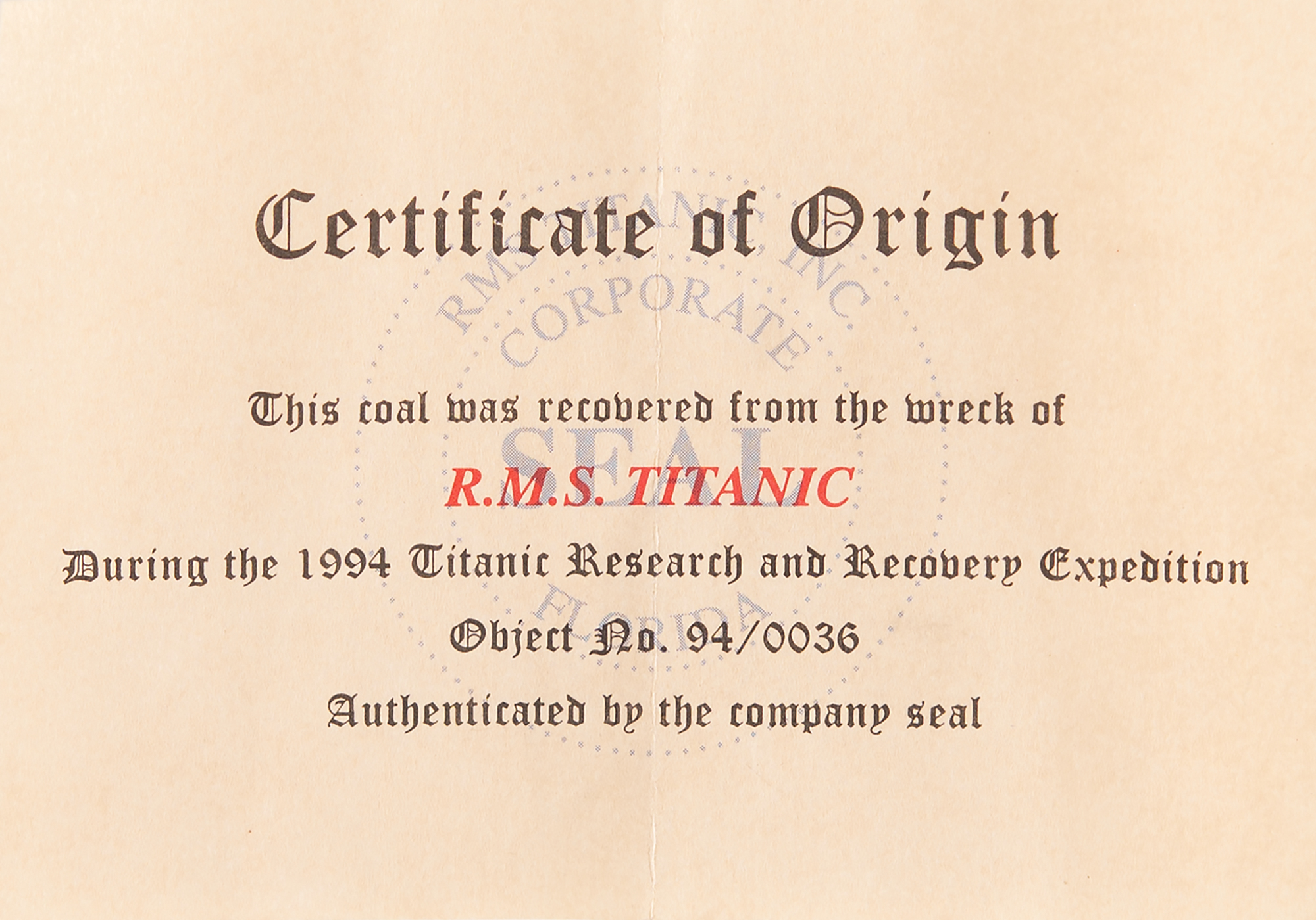 Small piece of coal recovered from the wreck of the RMS Titanic, which lies at a depth of roughly 12,500 feet, about 370 nautical miles south-southeast off the coast of Newfoundland in the Northern Atlantic Ocean. The coal piece weighs approximately 1 gram, measures about 18 mm x 10 mm x 7 mm, and is sealed in its bag labeled "Fragile / Titanic Coal." The piece was returned from the depths of the ocean during the 1994 Titanic Research and Recovery Expedition, and is accompanied by the certificate of origin from RMS Titanic, Inc. In fine condition.