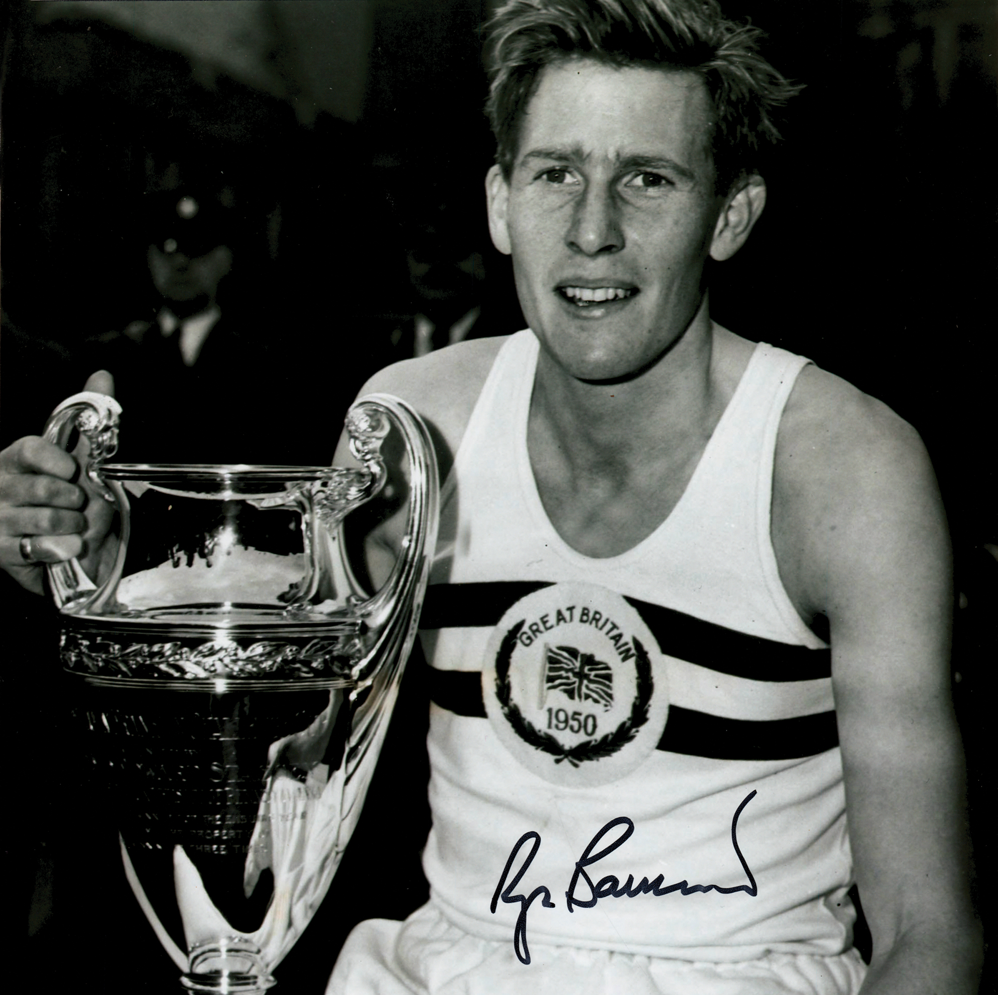 Satin-finish 8 x 8 photo of Roger Bannister posing with a trophy, signed in black felt tip by the pioneering four-minute miler. In very fine condition.