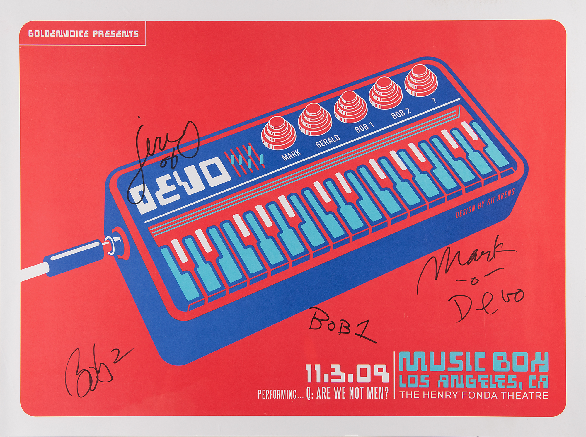 Color 24 x 18 poster for DEVO at the Henry Fonda Theater in Los Angeles on November 3, 2009, signed in black felt tip by Mark Mothersbaugh ("Mark - Devo"), Bob Mothersbaugh ("Bob 1"), Gerald Casale ("Jerry"), and Bob Casale ("Bob 2"). Rolled and in fine condition.