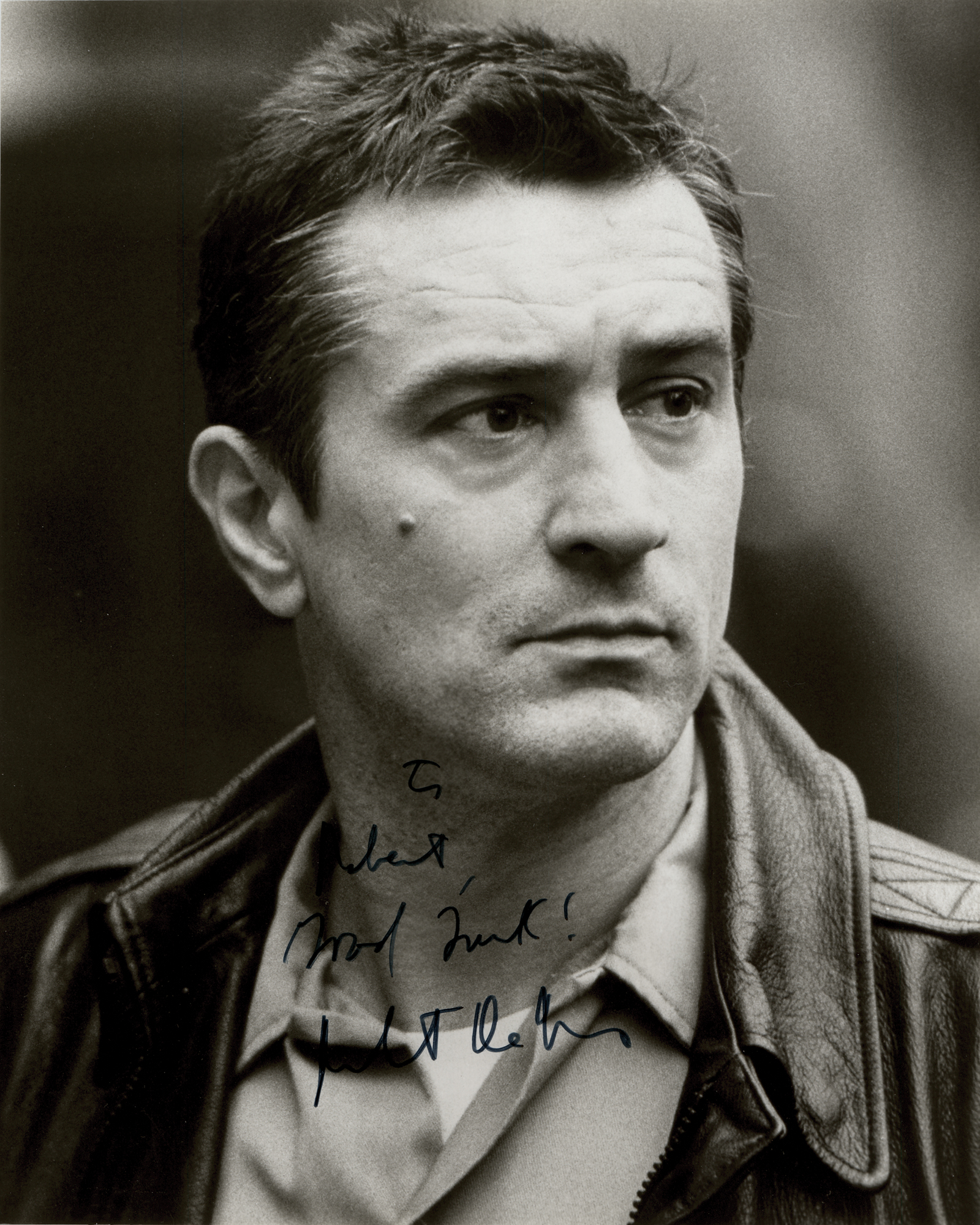 Color satin-finish 8 x 10 photo of De Niro as Jack Walsh in Midnight Run, signed and inscribed in black felt tip, "To Robert, Good Luck! Robert De Niro.” In fine condition.
