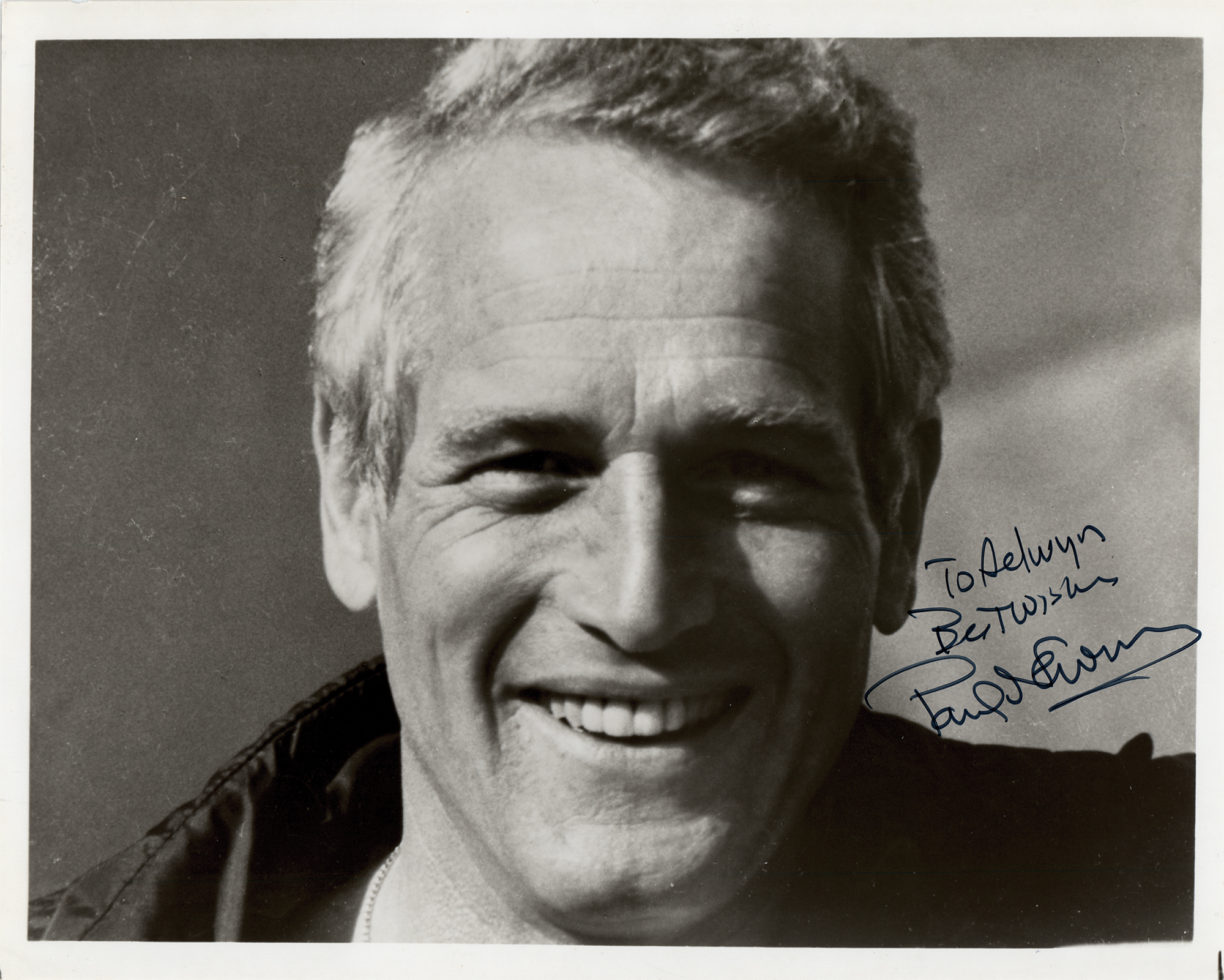 Glossy 10 x 8 photo of Newman smiling for the camera, signed and inscribed in black felt tip, "To Delwyn, Best Wishes, Paul Newman.” In fine condition, with a small crease to his right cheek.
