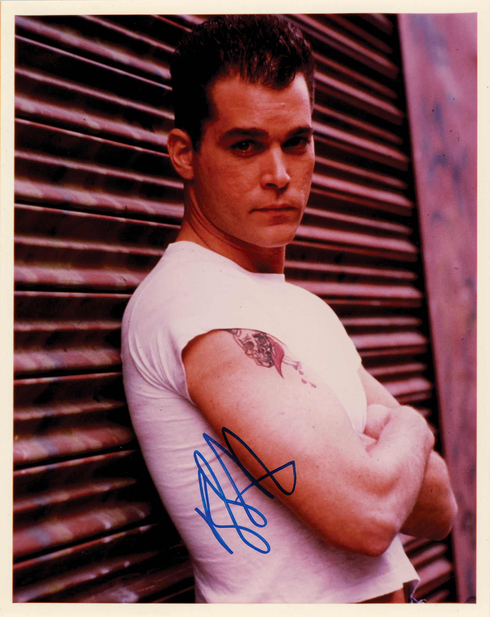 Color glossy 8 x 10 photo of Ray Liotta with his arms crossed, signed in blue felt tip. In fine condition.