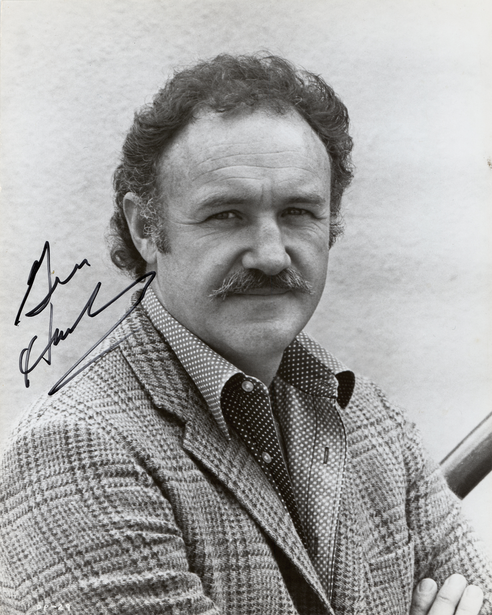 Glossy 8 x 10 photo of Gene Hackman in a head-and-shoulders pose, signed in black felt tip. In fine condition.