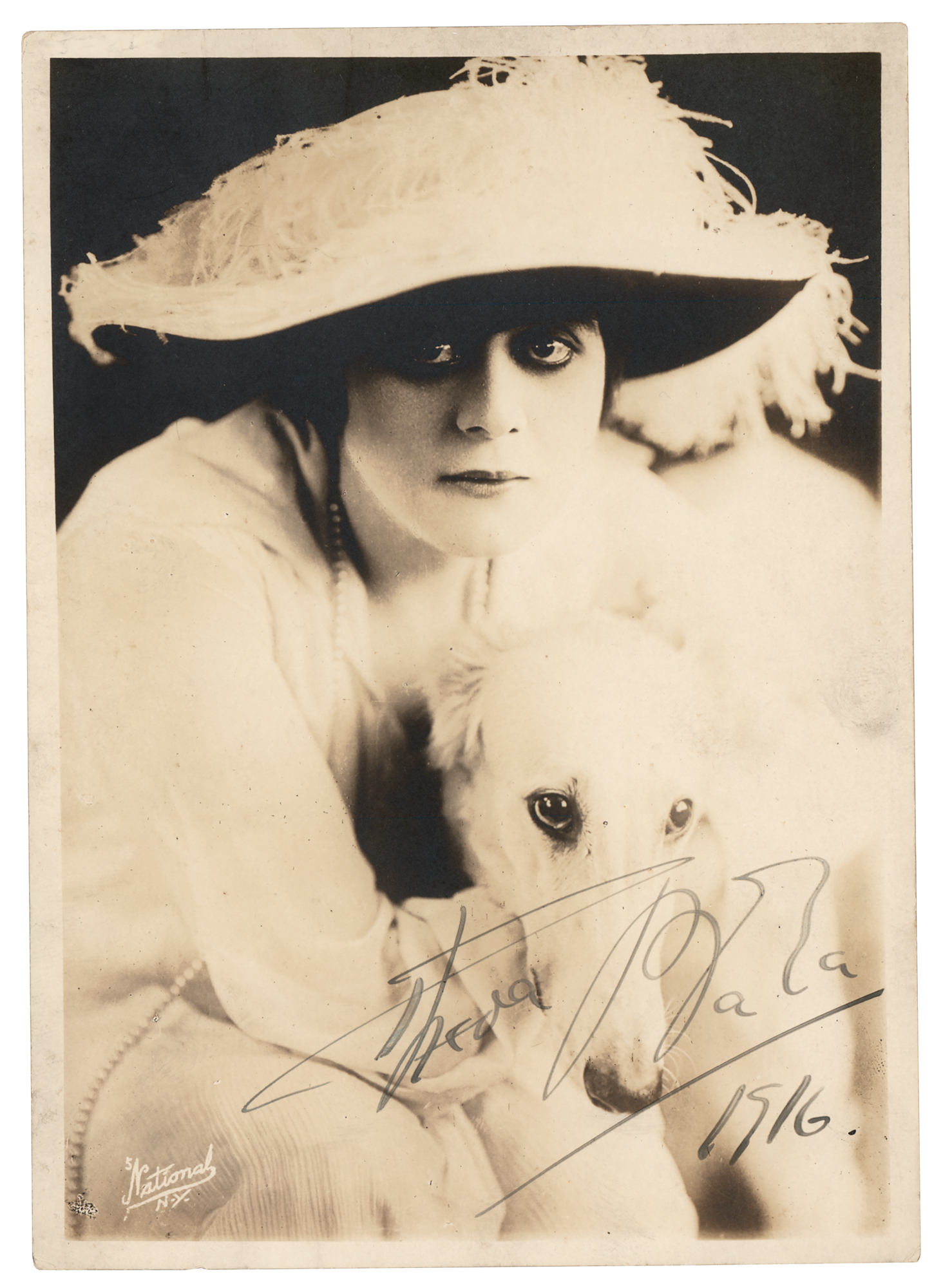 Popular silent actress (1885-1955) famous for her 'vamp' roles and known as one of cinema's first sex symbols. Matte-finish sepia 5 x 7 National Studios photo of Theda Bara wearing white and posing with Belva, her Russian Greyhound, signed in fountain pen. In fine condition, with silvering to the darker areas of the image.