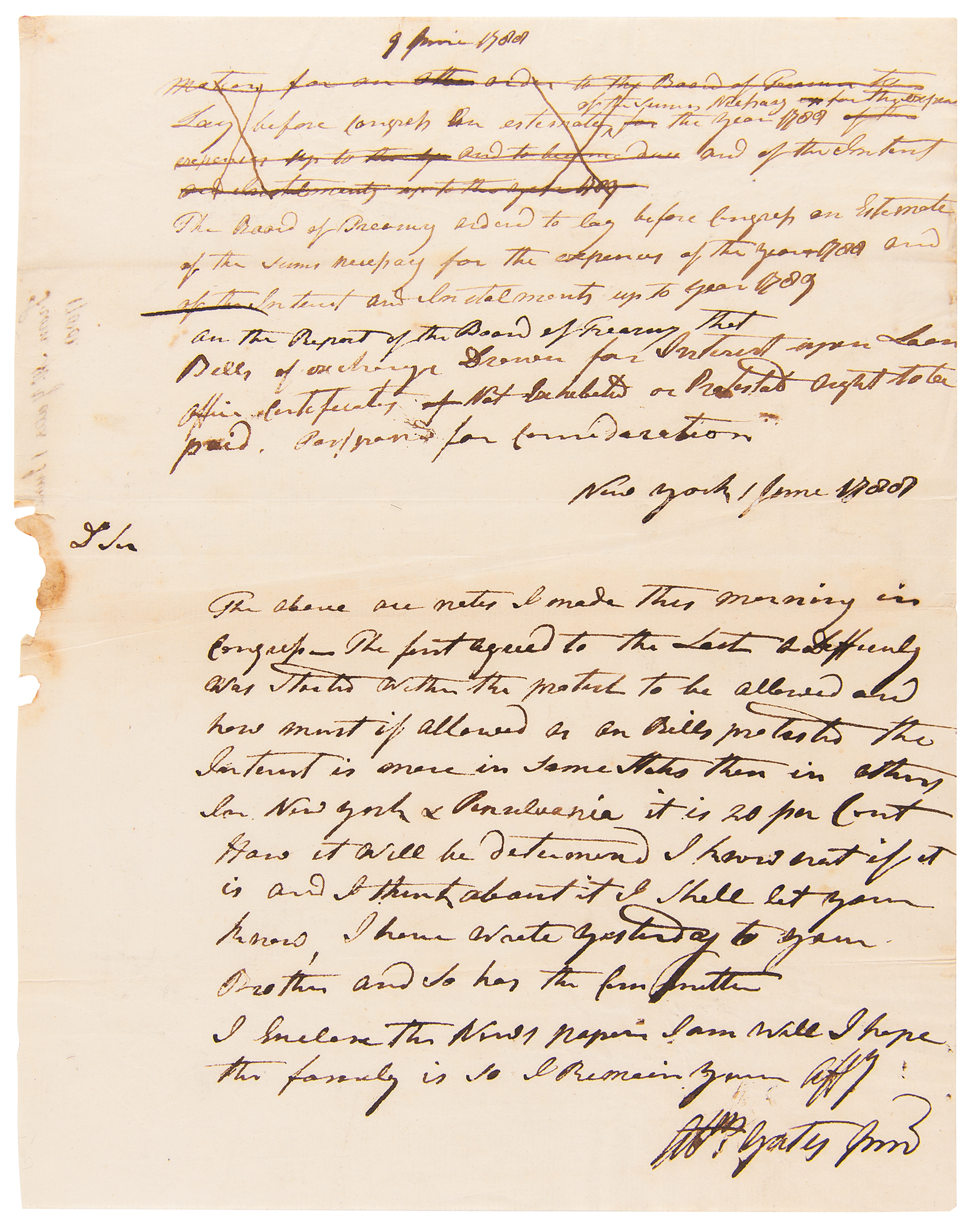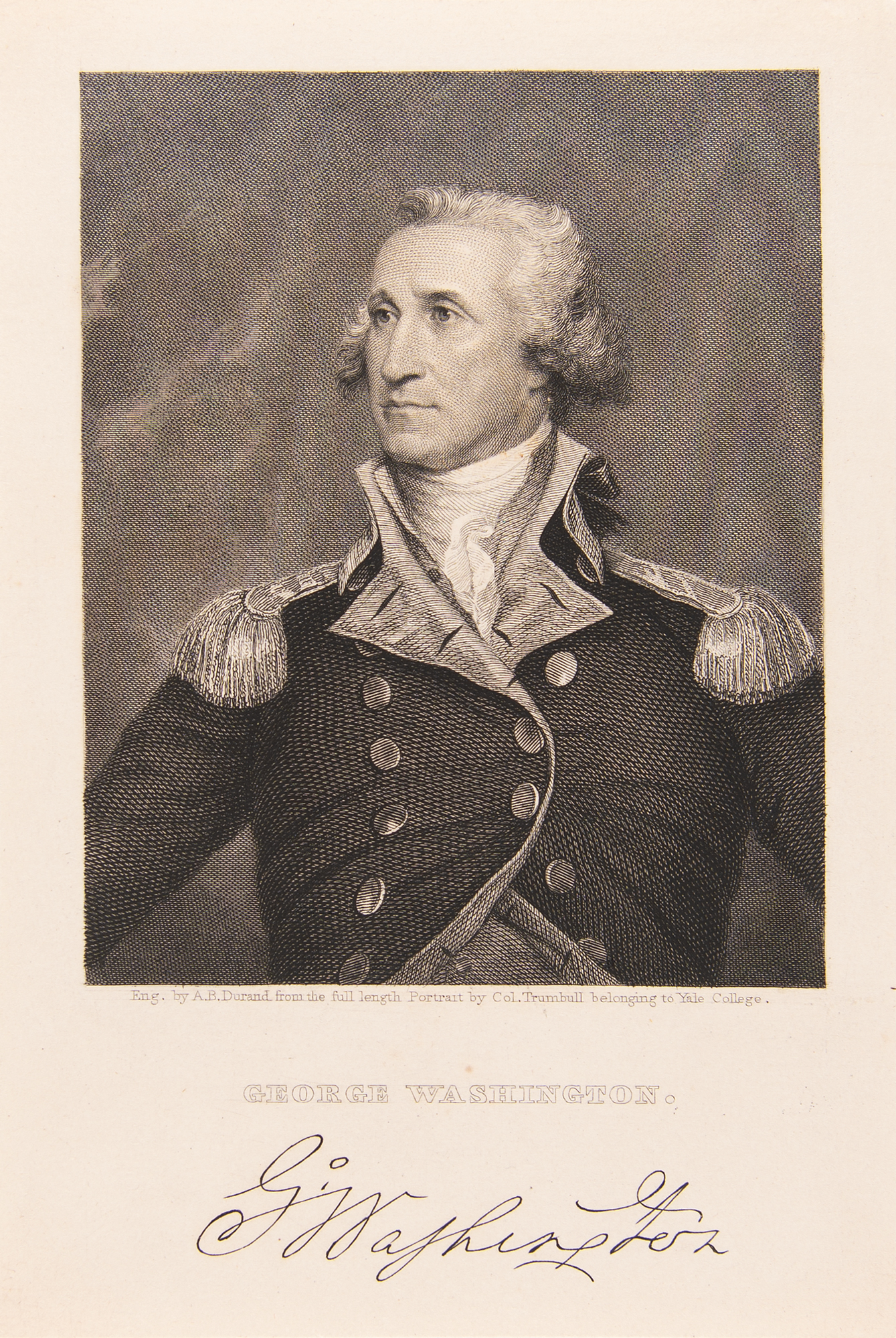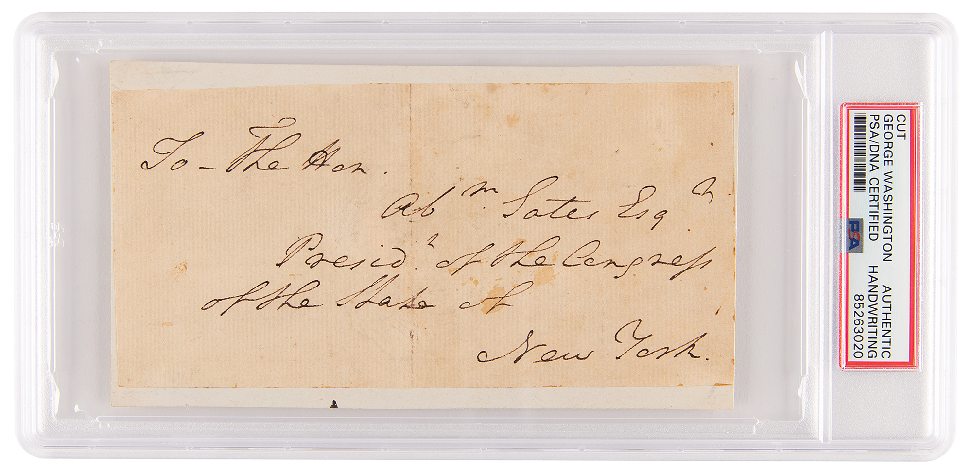 Extremely desirable envelope panel addressed entirely in the hand of George Washington, 6.25 x 3, no date but circa 1776, in full: "To the Hon. Ab'm Yates Esq'r, Presid't of the Congress of the State of New York." Affixed to a slightly larger sheet which bears a notation on the reverse by autograph dealer Walter R. Benjamin certifying the authenticity of the piece. In fine condition. Encapsulated in a PSA/DNA authentication holder. Accompanied by an engraved portrait with facsimile signature and a one-page ALS from Abraham Yates, signed “Abm. Yates, Jr.,” June 1, 1788, which contains “notes that I made this morning in Congress.” Abraham Yates became president of the New York Congress on August 28, 1776, and served in that role for only a month, presumably dating this piece to that historic year.