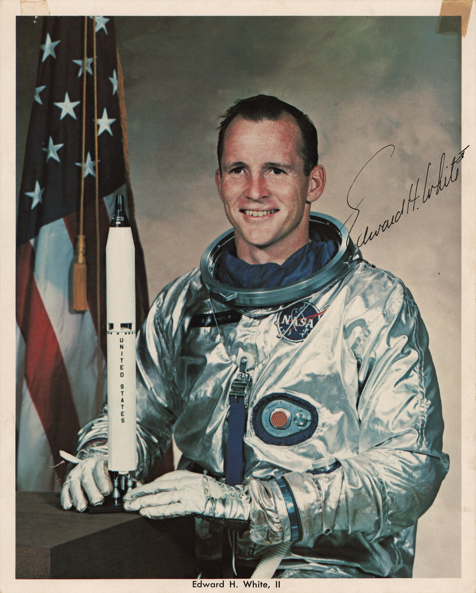 Official color 8 x 10 NASA lithograph of Ed White posing with a model rocket in his space suit, signed in black ink, "Edward H. White II.” In fine condition, with old tape stains to the top corners.