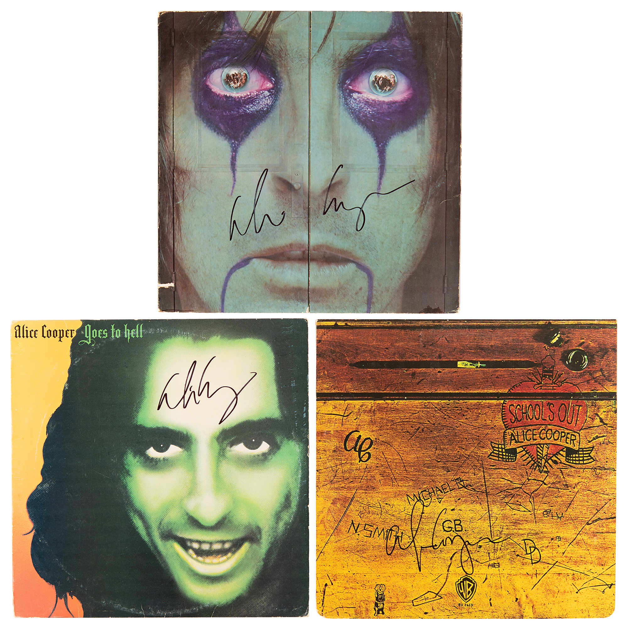 Three albums by Alice Cooper—Alice Cooper Goes to Hell, From the Inside, and School’s Out—signed on the front cover of each in black felt tip. In overall fine condition, with a discount cut to the From the Inside album. The records are included.