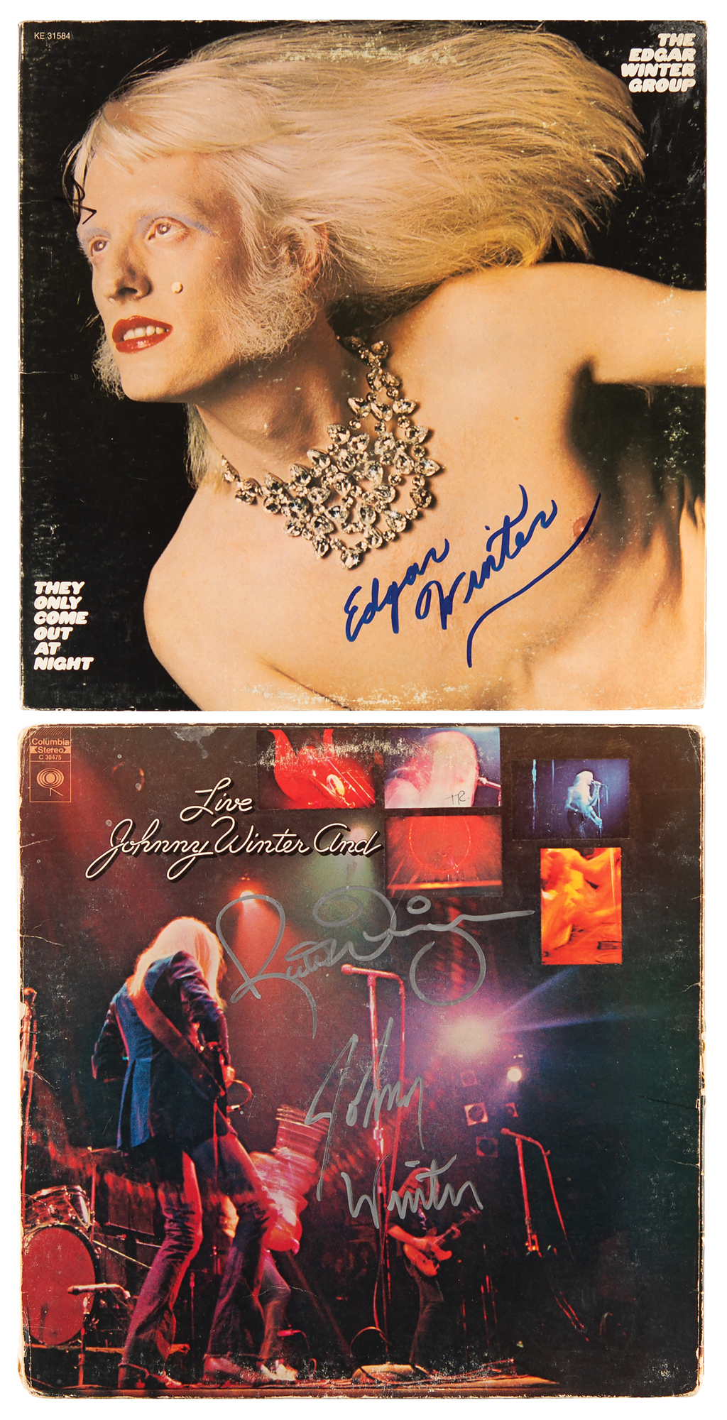 Two albums: Live Johnny Winter And album, signed on the front cover in silver ink by Johnny Winter and Rick Derringer; and They Only Come Out at Night album by The Edgar Winter Group, signed on the front cover in blue felt tip by Edgar Winter. In overall fine condition, with light scuffing and edge wear. The records are included.