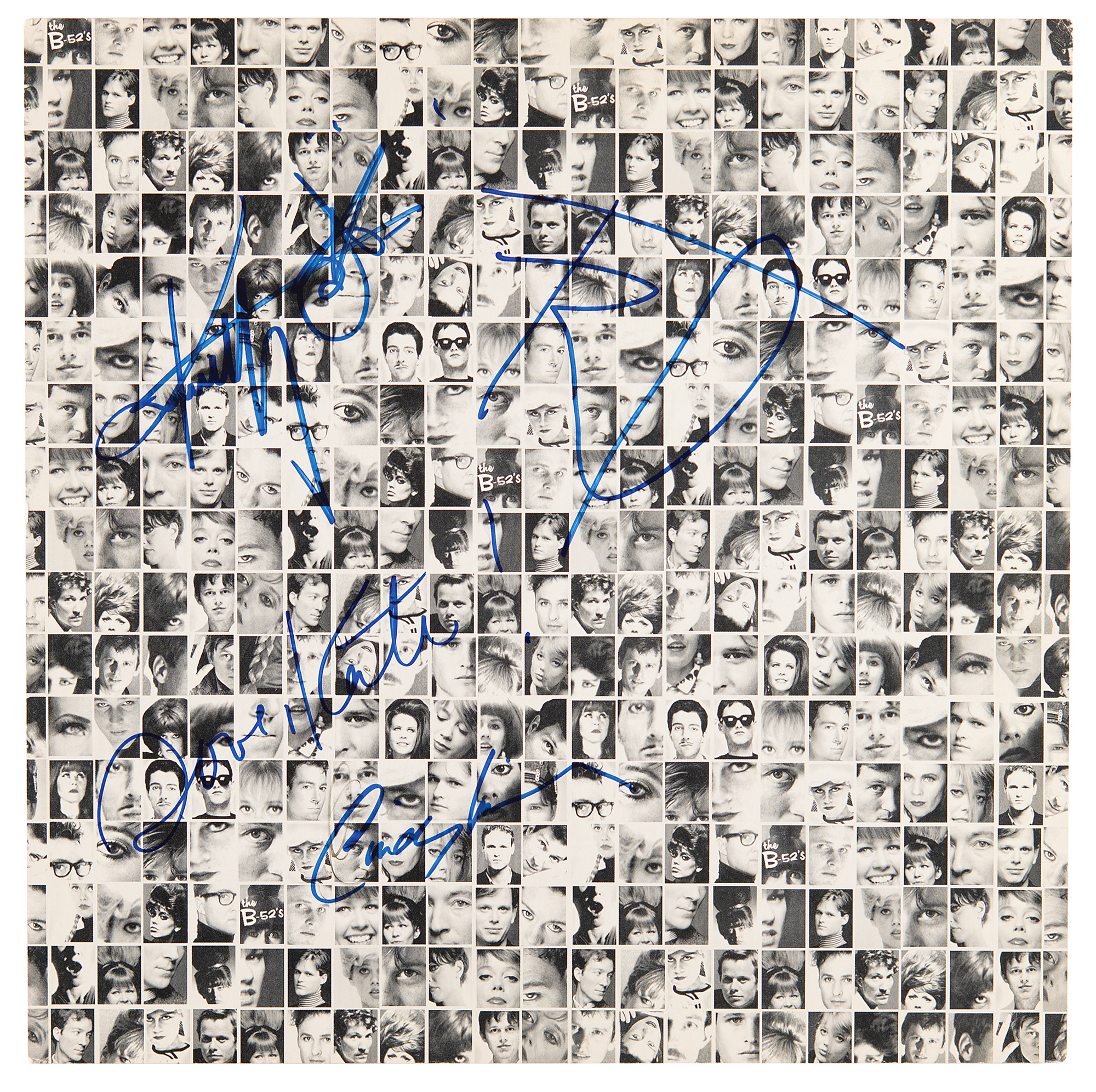 Time Capsule album flat by The B-52's, signed on the front in blue felt tip by Fred Schneider, Kate Pierson, Cindy Wilson, and Keith Strickland. In fine condition. The record is not included. Consignor notes that the signatures were obtained in person before a concert at the House of Blues in Cleveland, Ohio.
