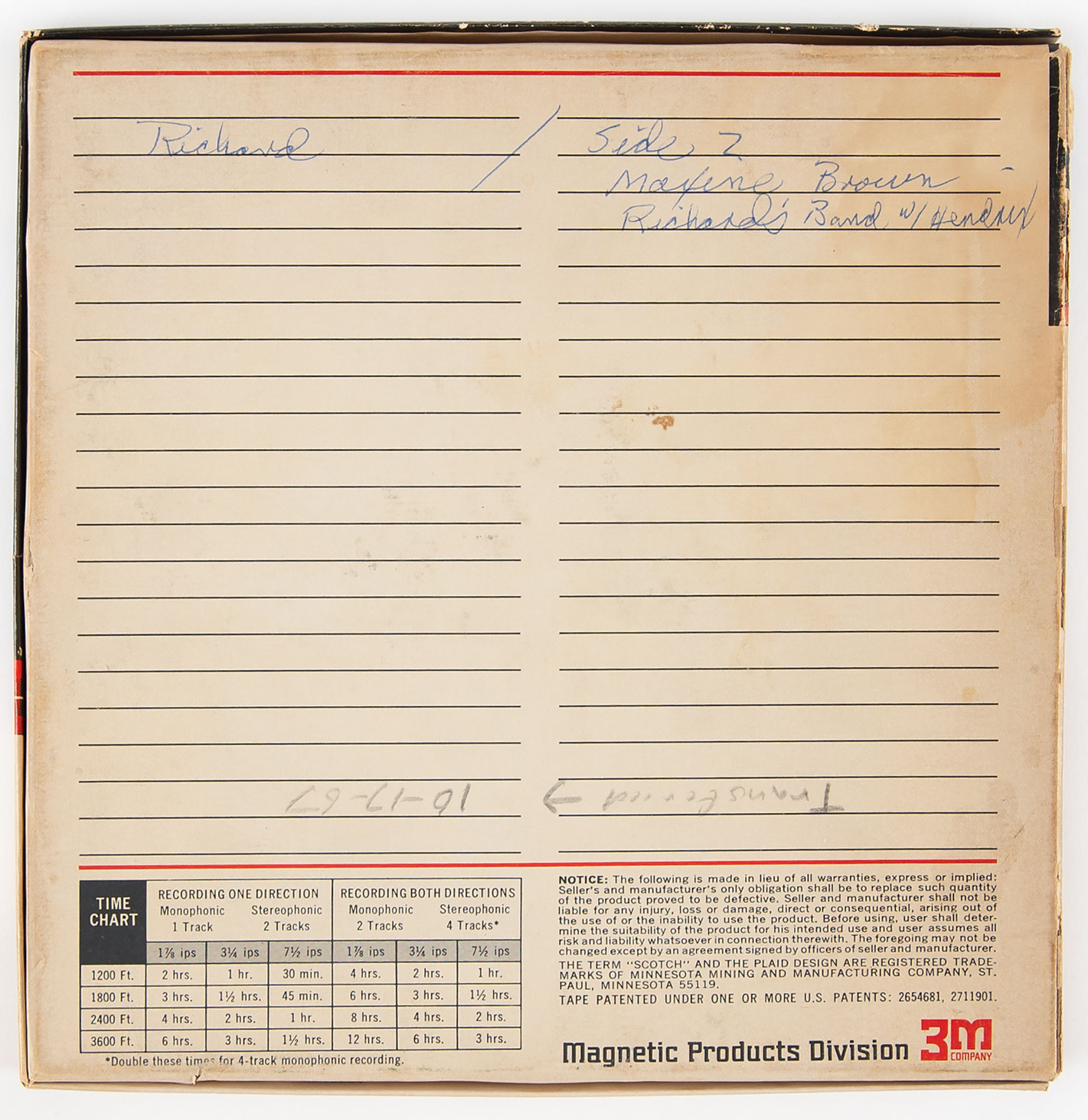 The recording was made by Boston radio personality Little Walter DeVenne on a Scotch 190 reel at 7.5 ips, and originates from his personal archives. The show opens with a 10-minute section of Hendrix playing with Don and Dewey, including the classic 'Shotgun.' Then, the emcee enthusiastically introduces Little Richard and his band: "I'd like for you to get together and welcome a young man who is delicate. Prettier than Cassius Clay. Swings harder than Roger Maris. He has more hits than Willie Mays. I want you to put your hands together now and make him feel good. You make him feel good now! Some of you girls can make him feel good later. Let's hear it now, a big hand for Little Richard!"