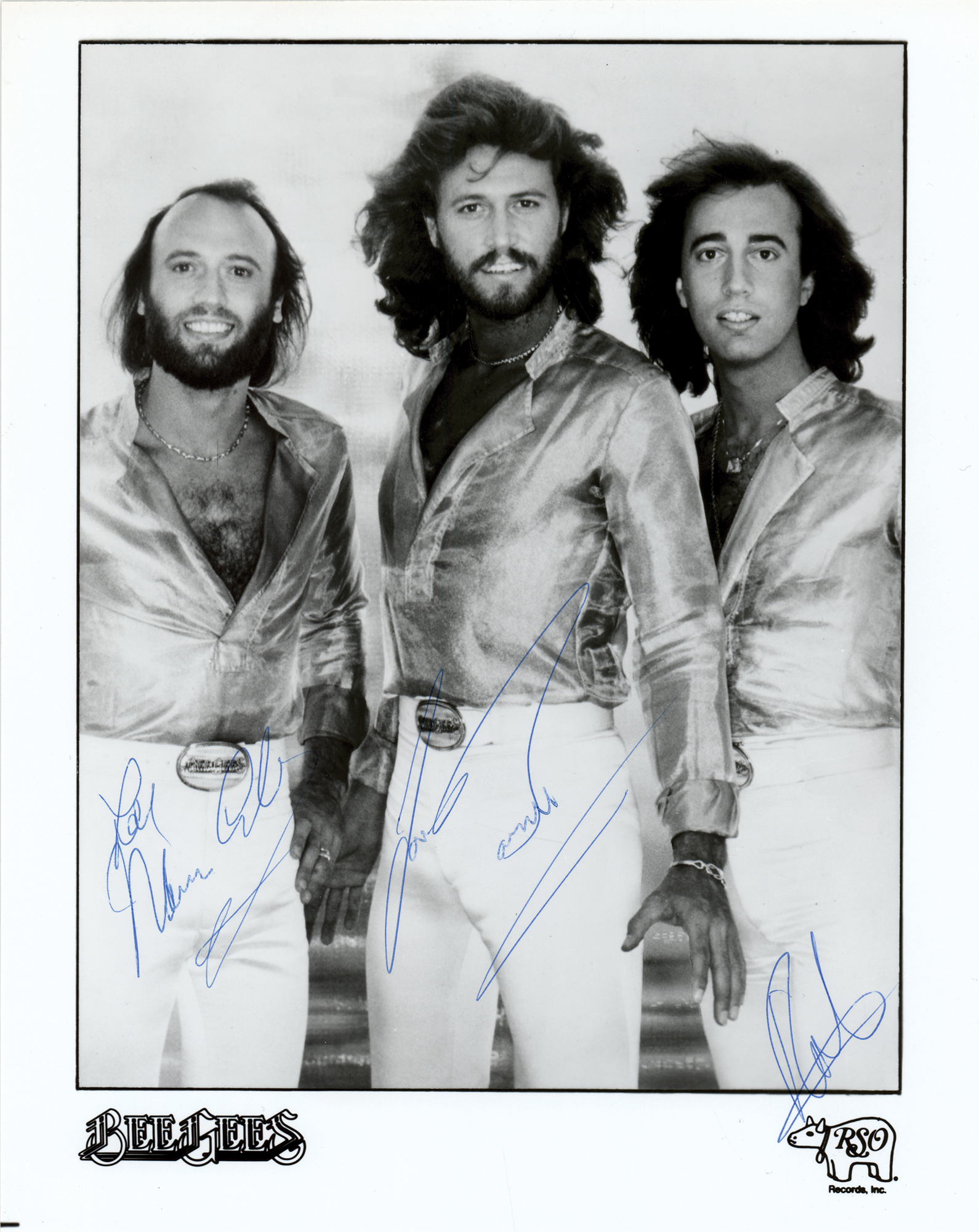 Glossy 8 x 10 RSO Records publicity photo of the Bee Gees in matching outfits, signed in blue ballpoint by Robin, Barry, and Maurice Gibb. In very fine condition.