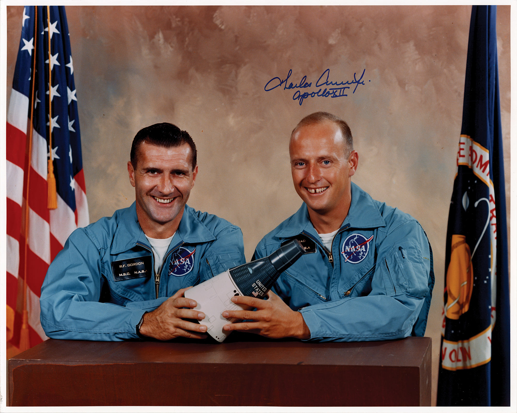 Color semi-glossy 20 x 16 photo of the Gemini 11 crew in their blue flight suits posing with a capsule model, signed in blue felt tip, “Charles Conrad, Jr., Apollo XII.” In fine condition, with some light creasing to the top edge.