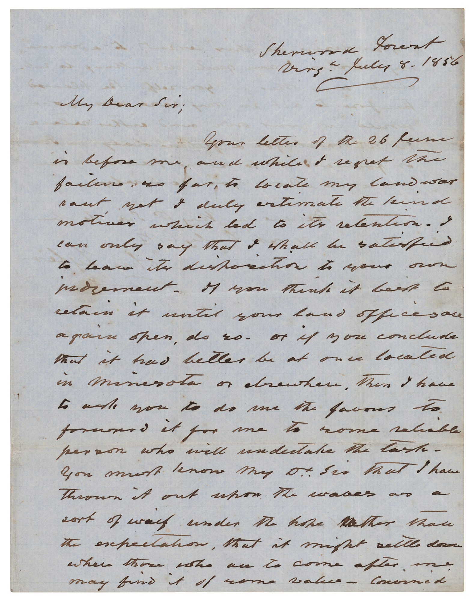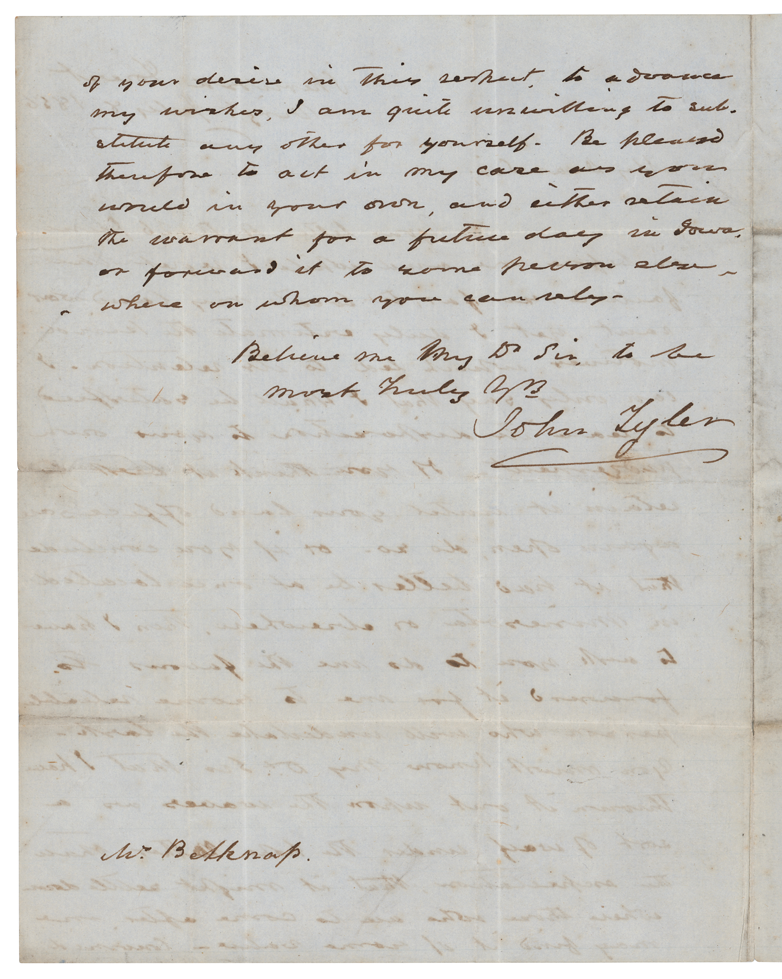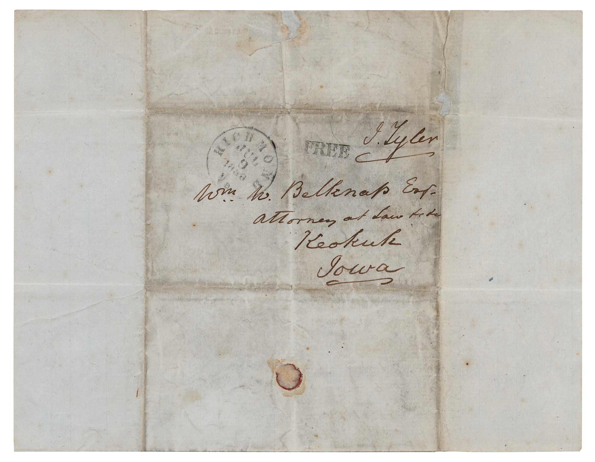 ALS, one page both sides, 8 x 10, July 8, 1856. Handwritten letter to attorney William Belknap, in full: “Your letter of the 26 June is before me and while I regret the failure so far, to locate my land warrant, yet I duly estimate the kind motives which led to its retention. I can only say that I shall be satisfied to learn Its deposition to your own judgment. If you think it best to retain it until your land offices are again open, do so, or if you conclude that It had better be at once located in Min[n]esota or elsewhere, then I have to ask you to do me the favor to forward it for me to some reliable person Who will undertake the task. You must know my D[ea]r Sir that I have thrown it out upon the water as a sort of waif under the hope rather than the expectation, that it might settle down where those who are to come after me may find it of some value. Convinced of your desire in this respect, to advance my wishes, I am quite unwilling to substitute any other for yourself. Be pleased therefore to act in my case as you would in your own, and either retain the warrant for a future day in Iowa, or forward it to some person elsewhere on whom you can rely.” The second integral page is hand-addressed and free-franked by Tyler, who signs as “J. Tyler.” In very good to fine condition, with intersecting folds, and some soiling to address panel.