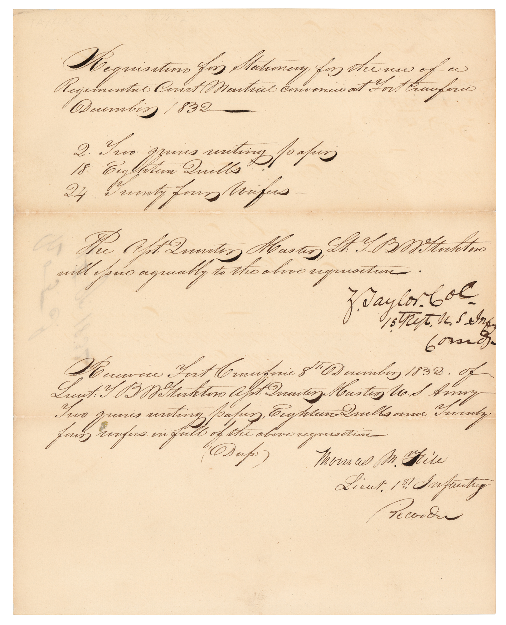 Manuscript DS, signed "Z. Taylor, Col., 1st Regt. U.S. Inf Comdr," one page, 8 x 9.75, December 1832. Request for stationery and writing supplies at Fort Crawford, in part: “Requisition for Stationery for the use of a Regimental Court Martial convened at Fort Crawford December 1832- 2. Two quires writing paper, 18. Eighteen Quills, 24. Twenty four wafers. The Capt. Quarter Master, Lt. B. W. Stockton will issue agreeably to the above requisition.” Signed below by Zachary Taylor with his rank and title. Countersigned by a 1st Infantry lieutenant who confirms receipt of the order on December 8, 1832. In fine condition.