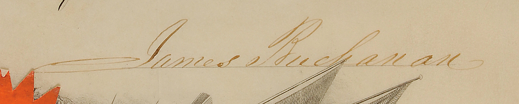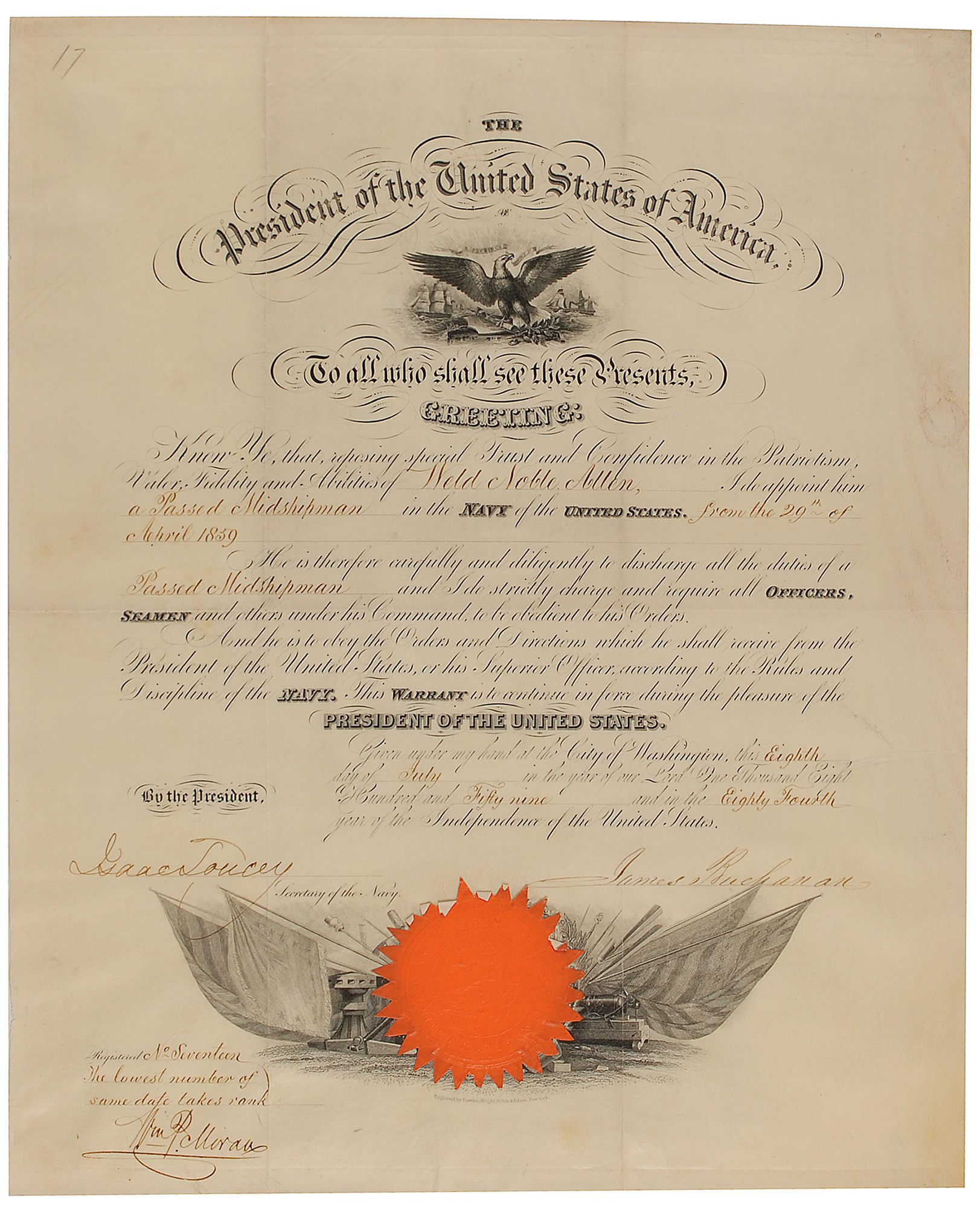 Partly-printed vellum DS as president, one page, 13.75 x 16.75, July 8, 1859. President Buchanan appoints Weld Noble Allen “a Passed Midshipman in the Navy of the United States.” Signed at the conclusion by James Buchanan and countersigned by Secretary of the Navy Isaac Toucey. The original orange Navy Department seal remains affixed to the lower vignette. In fine condition, with a small repaired hole to the right edge. Allen (1837-1875) graduated from the US Naval Academy in 1855 and commanded a navy gunboat in the Civil War as part of the Western Gulf Blockading Squadron.