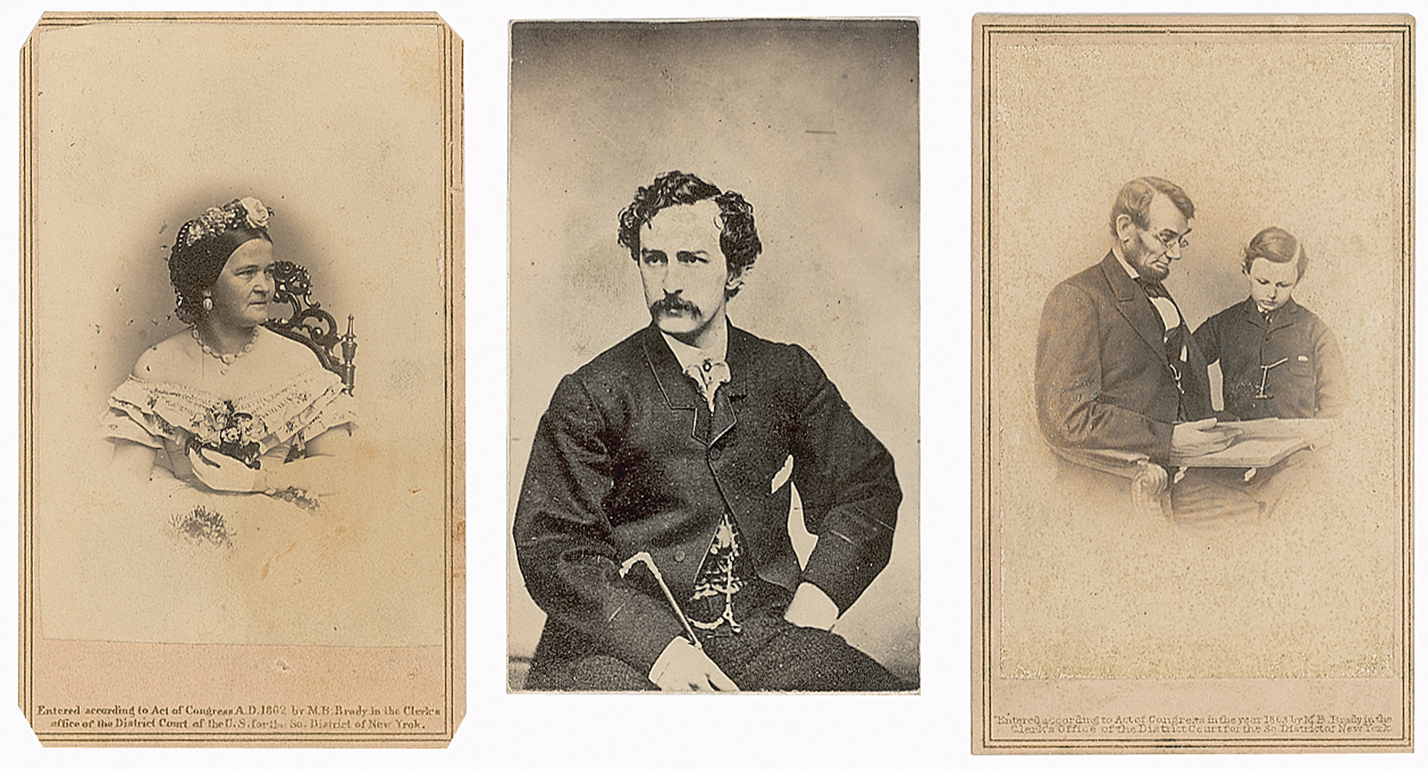 Desirable set of three uncommon carte-de-visite photos, including: a 2.25 x 4 portrait of Abraham Lincoln reading with his son Tad, after a photograph taken by Anthony Berger, published by Brady's National Photographic Portrait Galleries; a 2.5 x 4 portrait of Mary Todd Lincoln in a seated pose, published by E. &. H. T. Anthony of New York, from a negative in Brady's National Portrait Gallery; and a 2.25 x 3.5 portrait of Lincoln assassin John Wilkes Booth, published by G. W. Tomlinson of Boston. In overall very good to fine condition, with clipped corner tips to Mary Lincoln and trimmed edges to Booth.