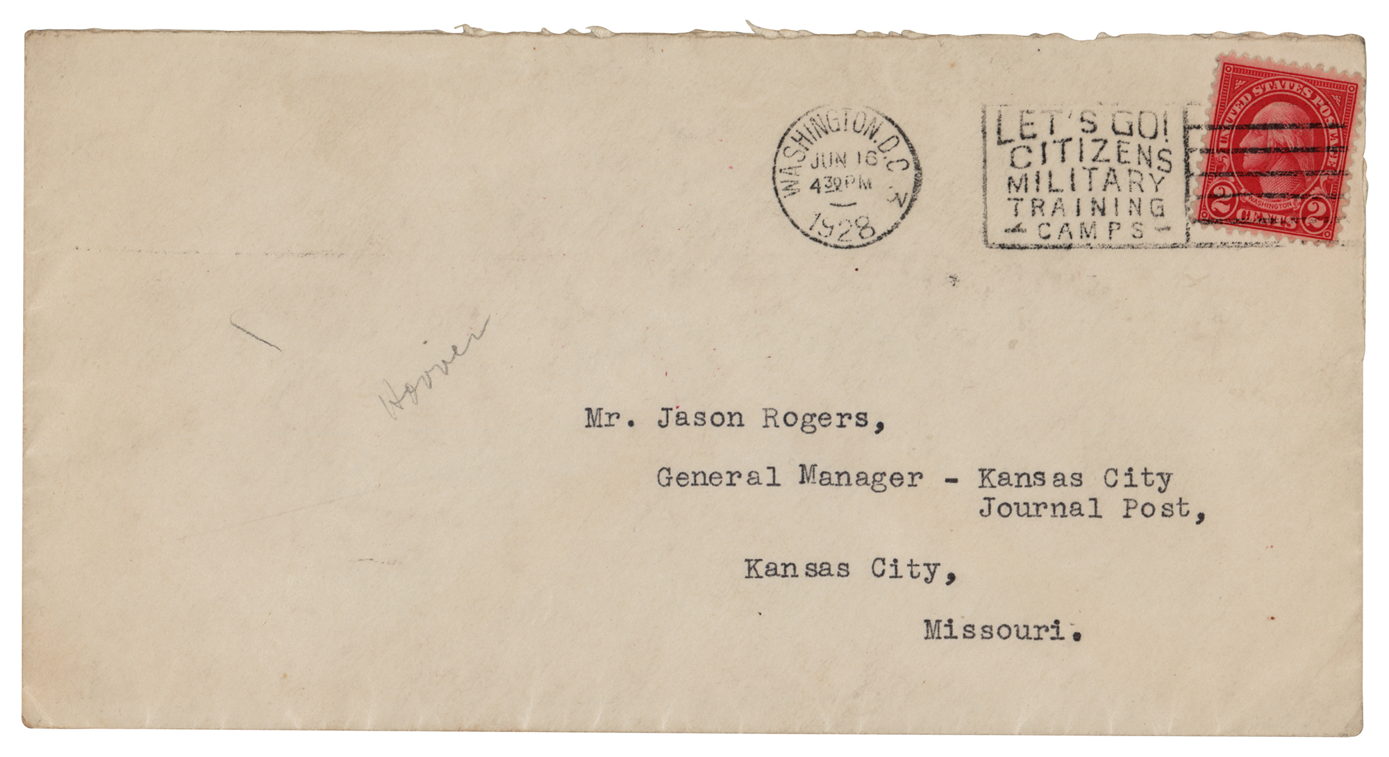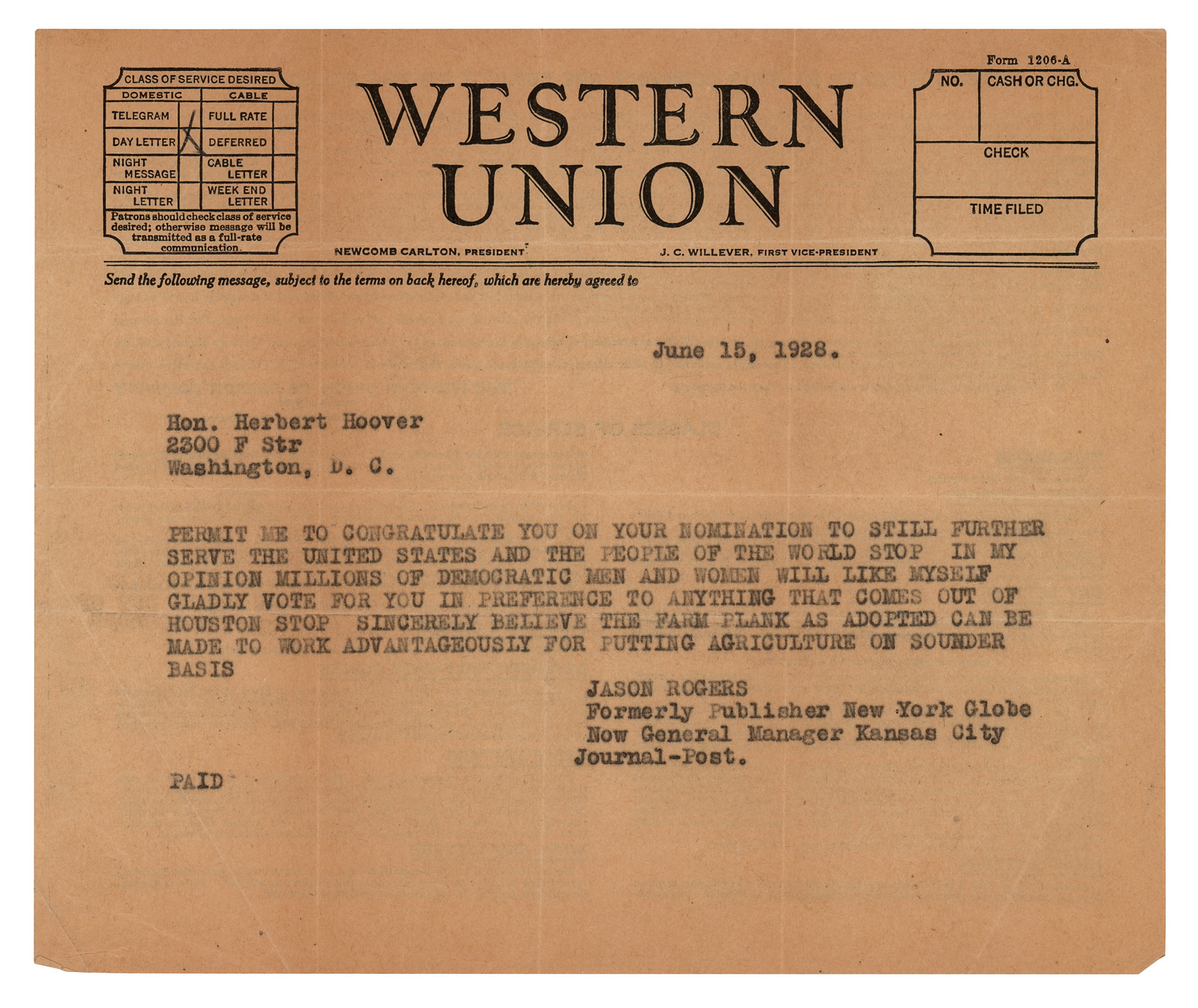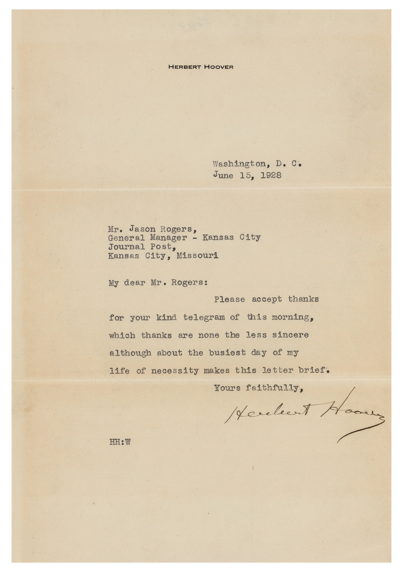 TLS, one page, 7 x 10.5, personal letterhead, June 15, 1928. Letter of thanks to Jason Rogers, General Manager of the Kansas City Journal Post. In full: "Please accept thanks for your kind telegram of this morning, which thanks are none the less sincere although about the busiest day of my life of necessity makes this letter brief." In fine condition. Accompanied by the original mailing envelope, as well as Rogers's telegram to Hoover, suggesting strong bipartisan support of his campaign: "Permit me to congratulate you on your nomination to still further serve the United States and the people of the world…millions of Democratic men and women will like myself gladly vote for you in preference to anything that comes out of Houston."