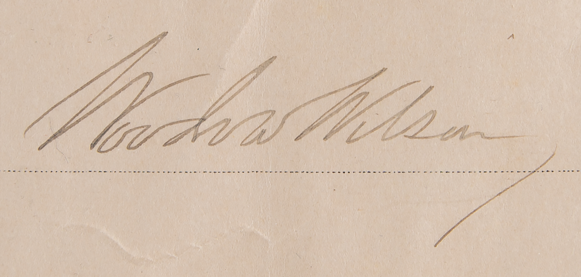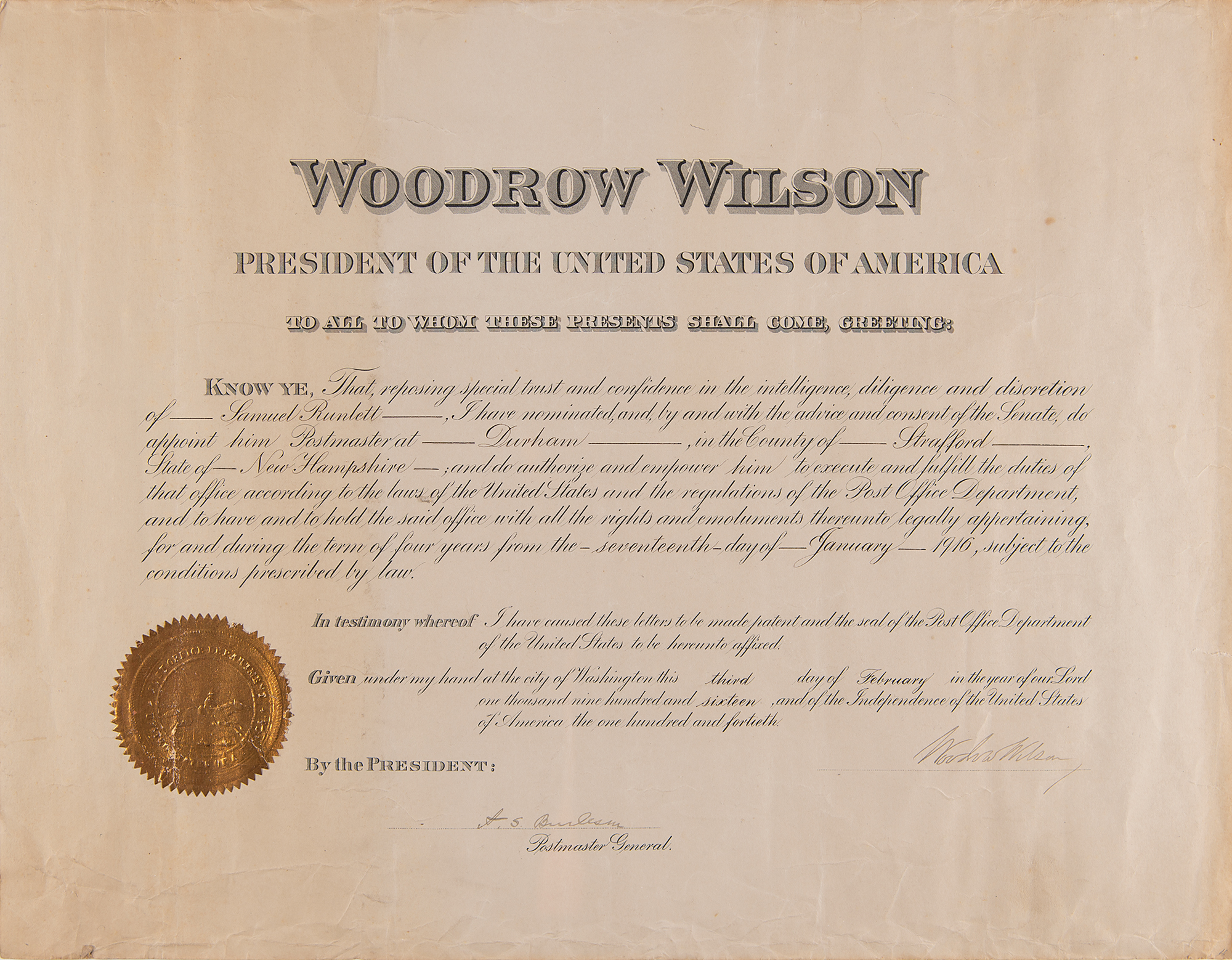 World War I-dated partly-printed DS as president, one page, 18 x 14, February 3, 1916. President Wilson appoints Samuel Runlett as "Postmaster at Durham, in the County of Strafford, State of New Hampshire." Signed neatly at the conclusion by Woodrow Wilson and countersigned by Postmaster General Albert S. Burleson. The gold Post Office Department seal remains affixed to the lower left corner. In very fine condition, with light irregular toning, a short edge tear, and moderately heavy creasing to the bottom blank area.