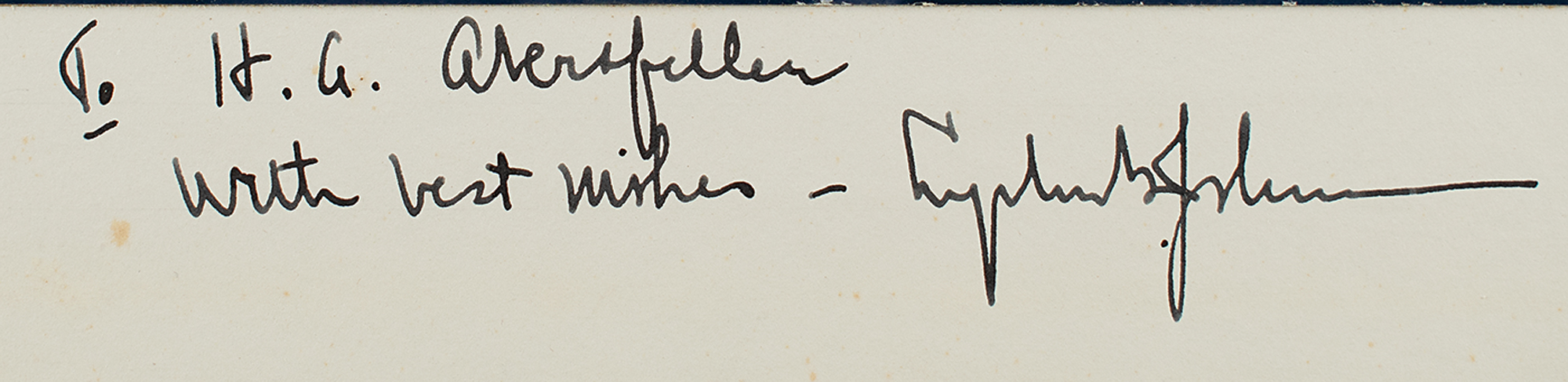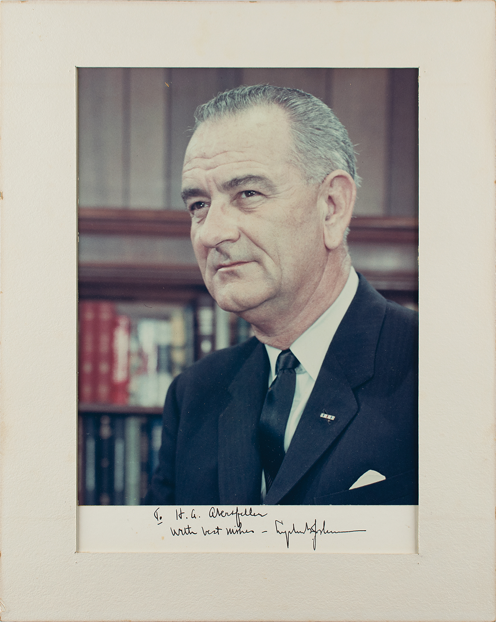 Vintage color semi-glossy 10.25 x 13.25 photo of Johnson affixed to its original 14 x 17 mount, signed and inscribed on the mount in fountain pen, "To H. A. Abersfeller, With best wishes—Lyndon B. Johnson.” In fine condition. Includes the contemporary mat, now detached. Heinz Abersfeller was a longtime executive in the General Services Administration, where he held several top positions on committees to codify minority contracting policies and safety standards for government-use vehicles.