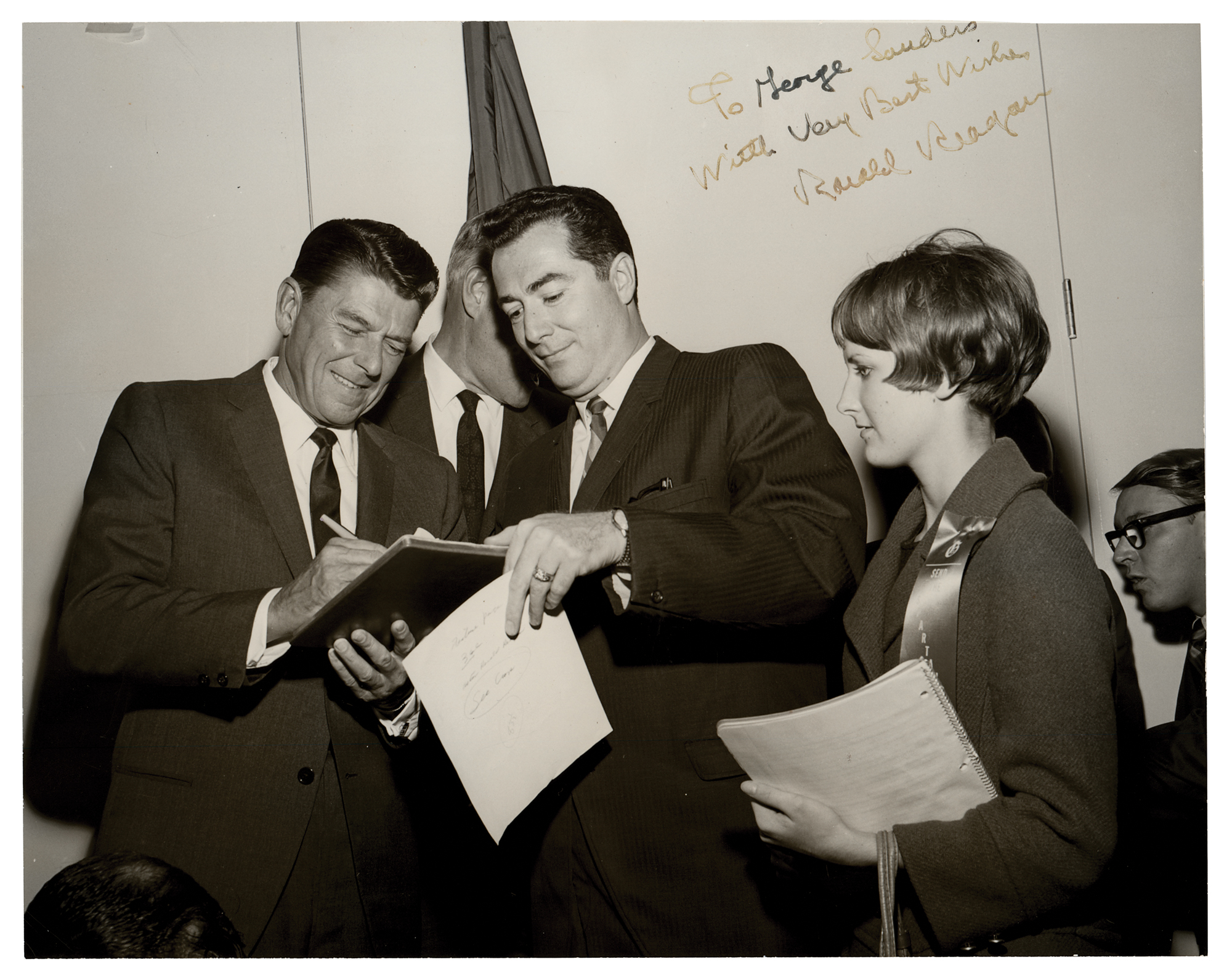 Vintage glossy 9.5 x 7.5 photo of Reagan signing autographs, signed and inscribed in black felt tip, "To George Sanders, With Very Best Wishes, Ronald Reagan.” In very good to fine condition, with trimmed edges, fading to the handwriting, and Sanders' first name evidently embellished in an unknown hand.