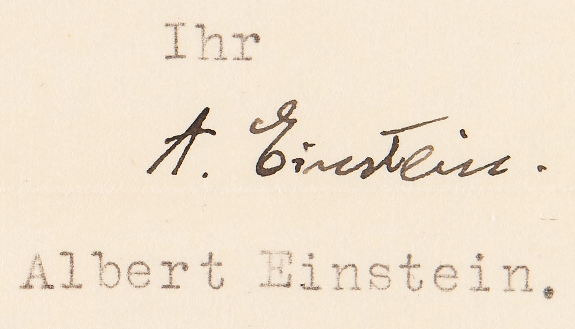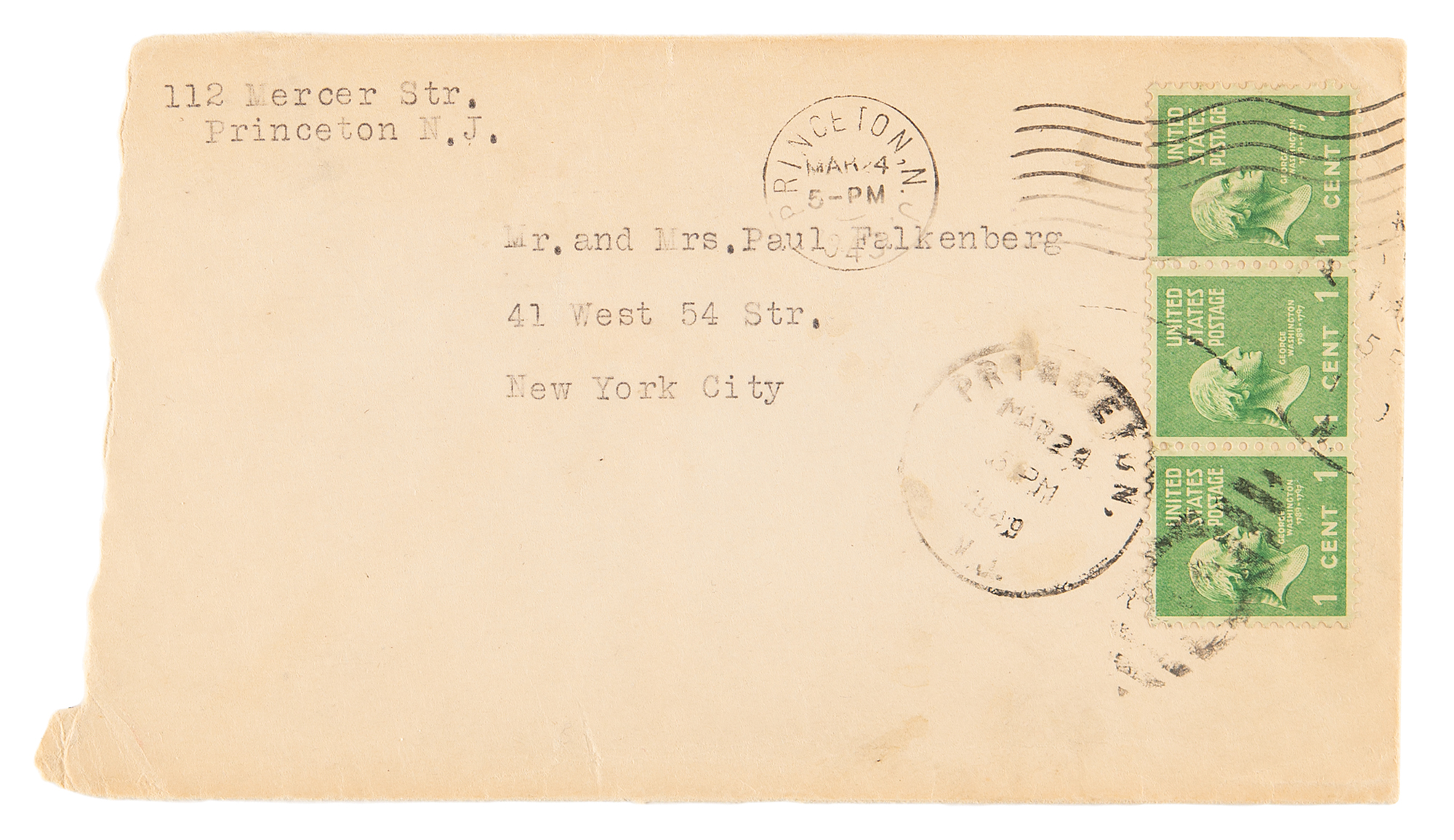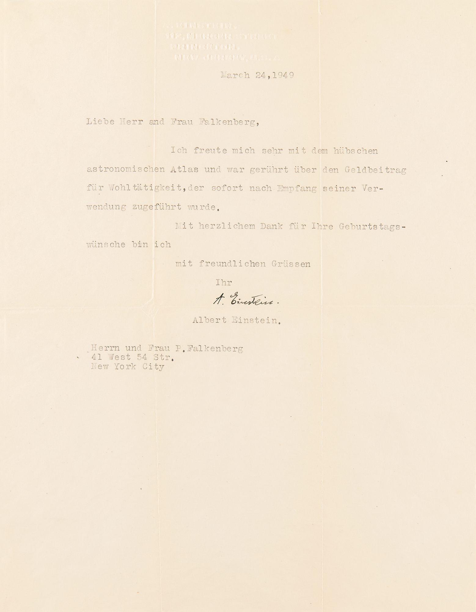 TLS in German, signed "A. Einstein," one page, 8.5 x 11, blindstamped personal Princeton letterhead, March 24, 1949. Letter to Mr. And Mrs. Paul Falkenberg. In full (translated): "I was very pleased to receive the pretty astronomic atlas and indeed touched by the money you sent for charitable purposes. On receipt, the funds were immediately directed towards the intended use. Thanking you from the bottom of my heart for your birthday wishes, I remain with best regards." In fine condition. Accompanied by the original mailing envelope. One can imagine that Einstein was inundated with gifts relating to the cosmos throughout his years, given his monumental work in observing and defining the universe.