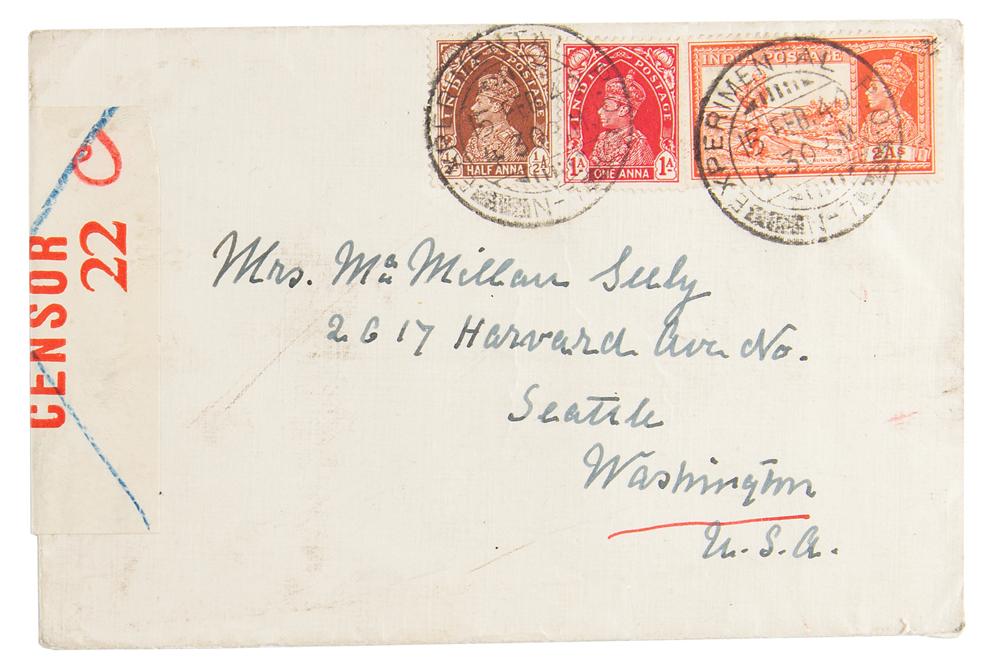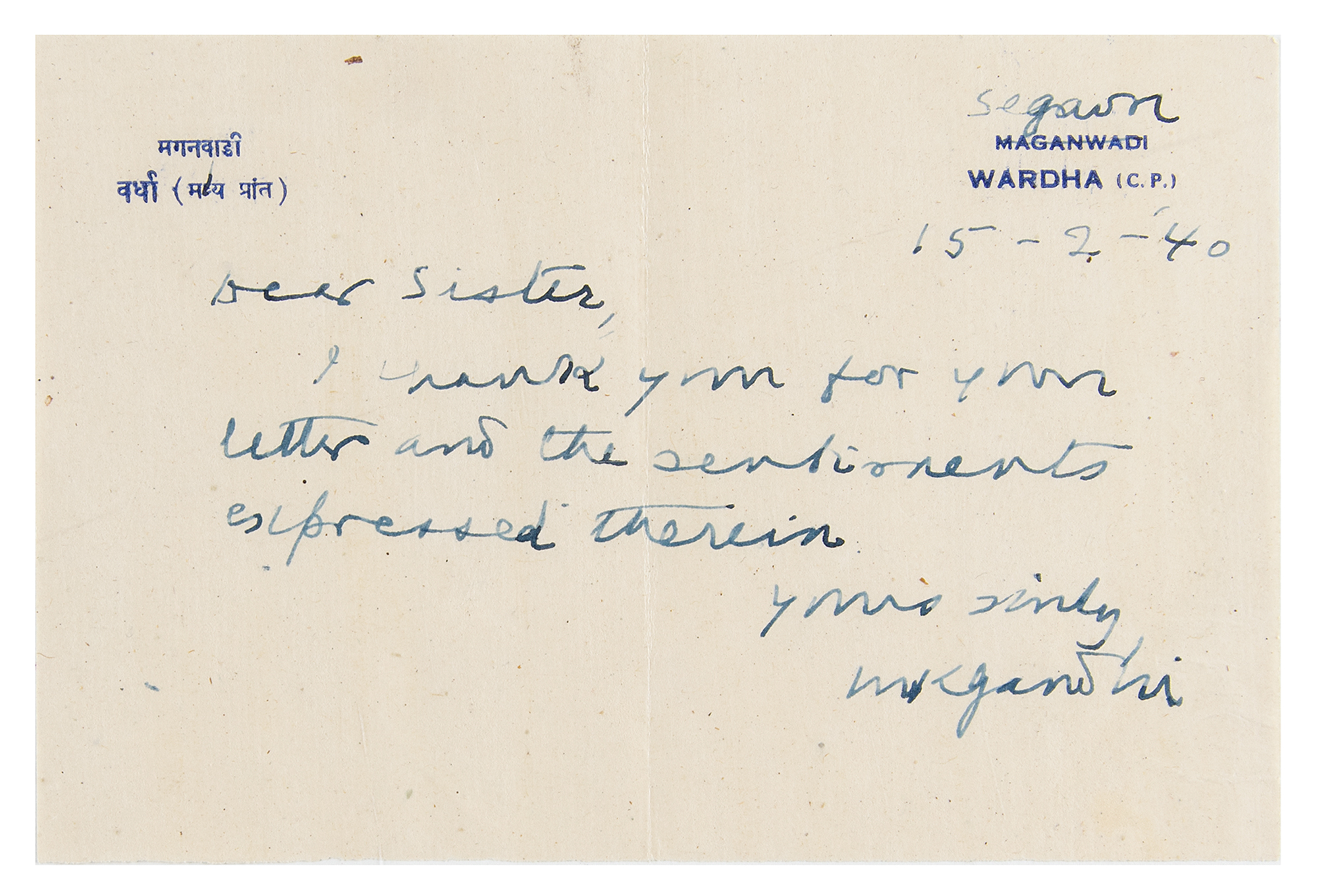 ALS signed “M. K. Gandhi,” one page, 6.5 x 4, February 15, 1940. Handwritten letter to an American admirer, in full: "Dear sister, I thank you for your letter and the sentiments expressed therein." Gandhi has struck through "Maganwadi" in the letterhead and written "Segaon" above. In fine condition. Accompanied by the original mailing envelope, with "Passed by Censor" label and Indian postage stamps, addressed in another hand to Mrs. McMillan Seely of Seattle, Washington; this was likely Harriet McMillan Seely, the granddaughter of Minnesota Senator Samuel J. R. McMillan, an autograph collector. Housed in a handsome custom-made clamshell box with slipcase.