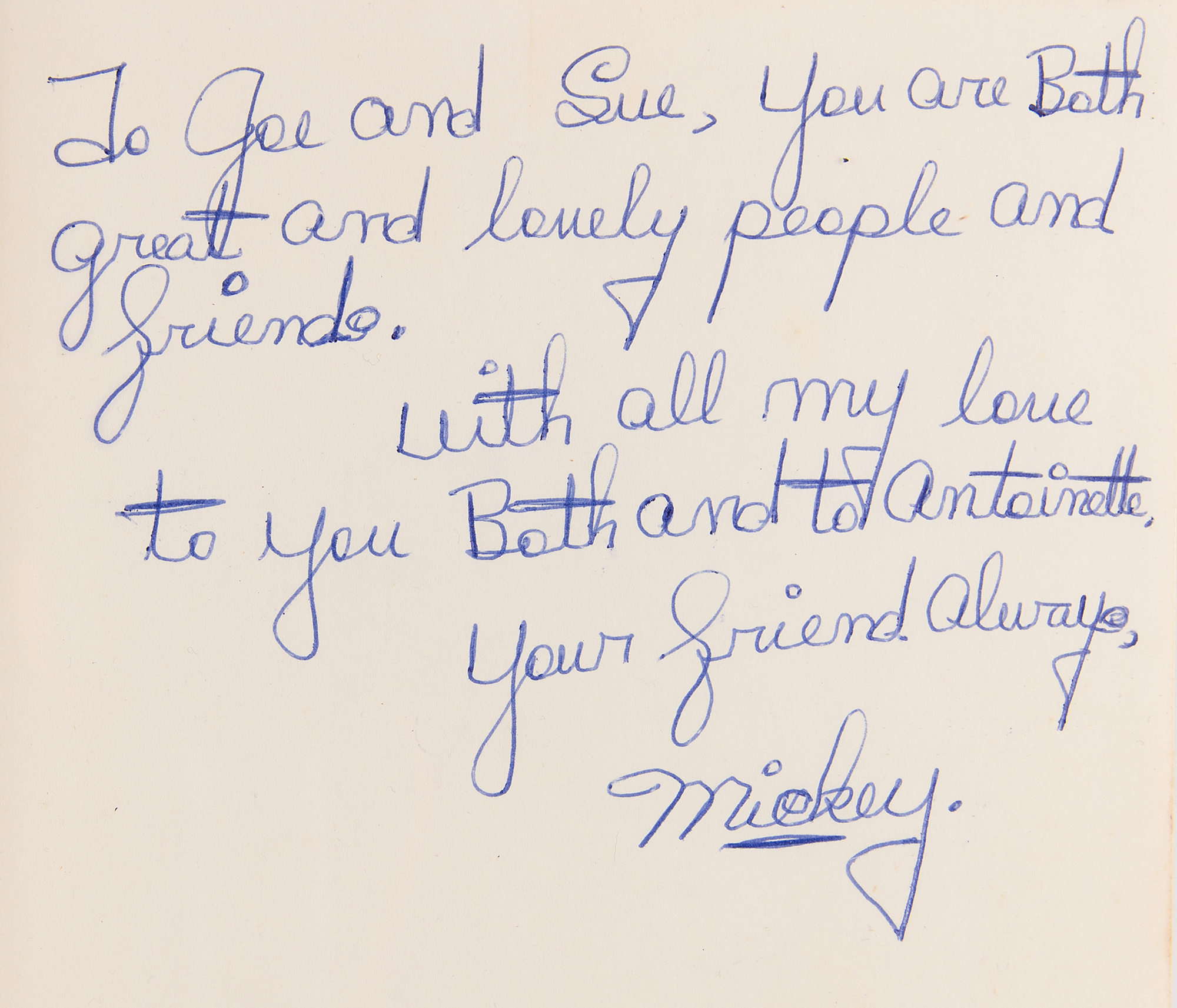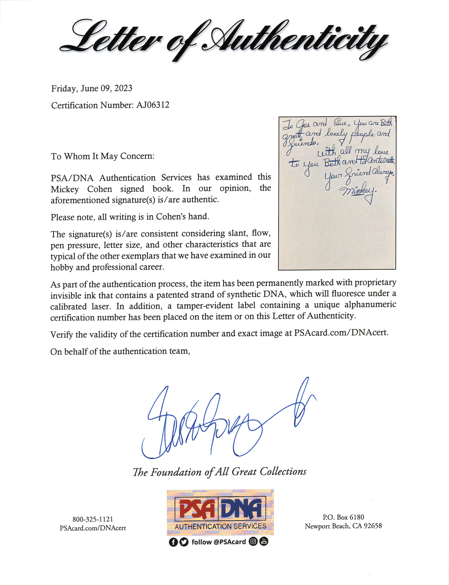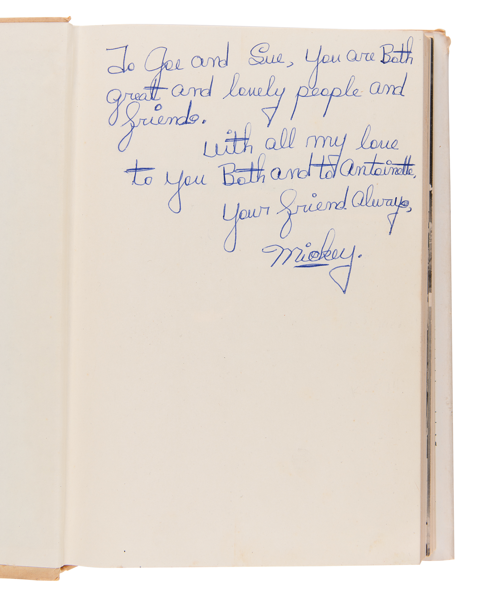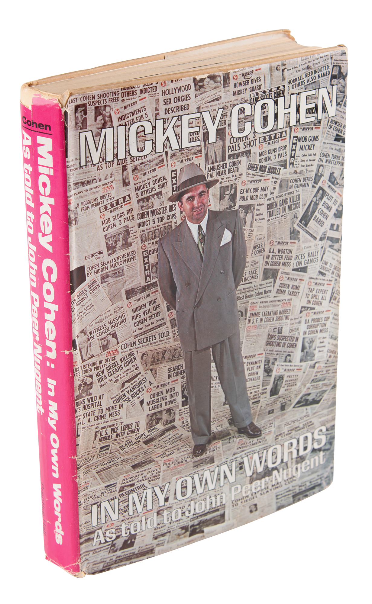 Signed book: Mickey Cohen: In My Own Words. First edition. Englewood Cliffs, New Jersey: Prentice-Hall, 1975. Hardcover with dust jacket, 6.25 x 9.25, 264 pages. Signed and inscribed on the half-title page in blue ballpoint, “To Joe and Sue, you are both great and lovely people and friends. With all my love to you both and to Antionette, your friend always, Mickey.” In very good to fine condition, with wear to the dust jacket. Accompanied by a full letter of authenticity from PSA/DNA. Cohen's signature is uncommon in any format.